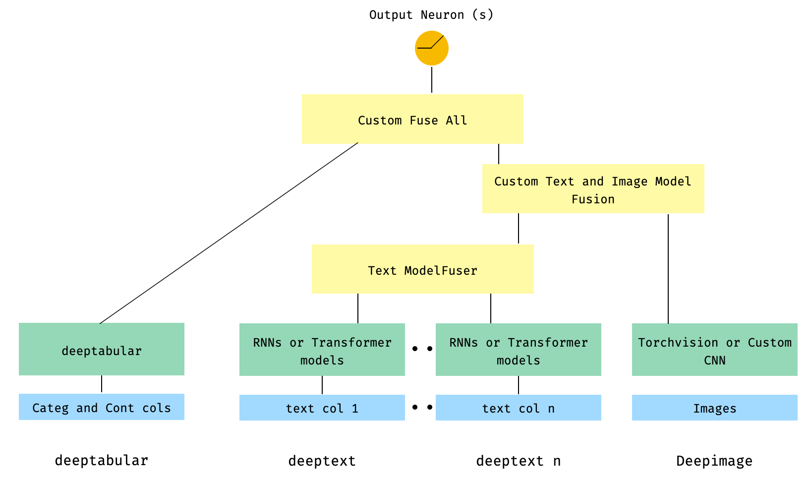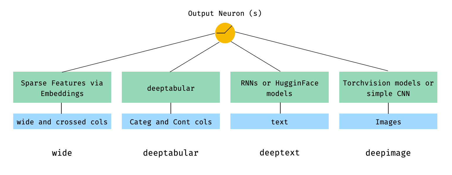 Im Allgemeinen ist pytorch-widedeep ein Paket, das Deep Learning mit tabellarischen Daten verwendet. Insbesondere soll die Kombination von Text und Bildern mit entsprechenden tabellarischen Daten mit breiten und tiefen Modellen erleichtert werden. Vor diesem Hintergrund gibt es eine Reihe von Architekturen, die mit der Bibliothek implementiert werden können. Die Hauptkomponenten dieser Architekturen sind in der folgenden Abbildung dargestellt: