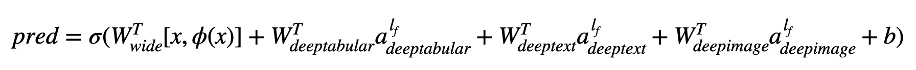 Wenn σ die Sigmoidfunktion ist, sind 'W' die auf das breiten Modell angewendeten Gewichtsmatrizen und die endgültigen Aktivierungen der tiefen Modelle "A" sind diese endgültigen Aktivierungen, φ (x) sind die Querprodukttransformationen der ursprünglichen Merkmale "x" und "B" ist der BIAS -Term. Wenn Sie sich fragen, was "Cross-Produkt-Transformationen" sind, ist hier ein Zitat, das direkt aus dem Papier entnommen wird: "Für binäre Merkmale ist eine Querprodukt-Transformation (z. B." und (Geschlecht = weiblich, Sprache = en) ") 1, wenn und nur dann, wenn die konstituierenden Merkmale (" Geschlecht = weiblich "und" Sprache = EN ") alle 1 und 0 sind, und 0, anderweitig."