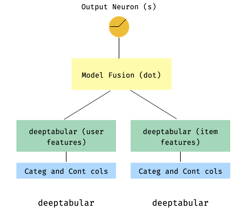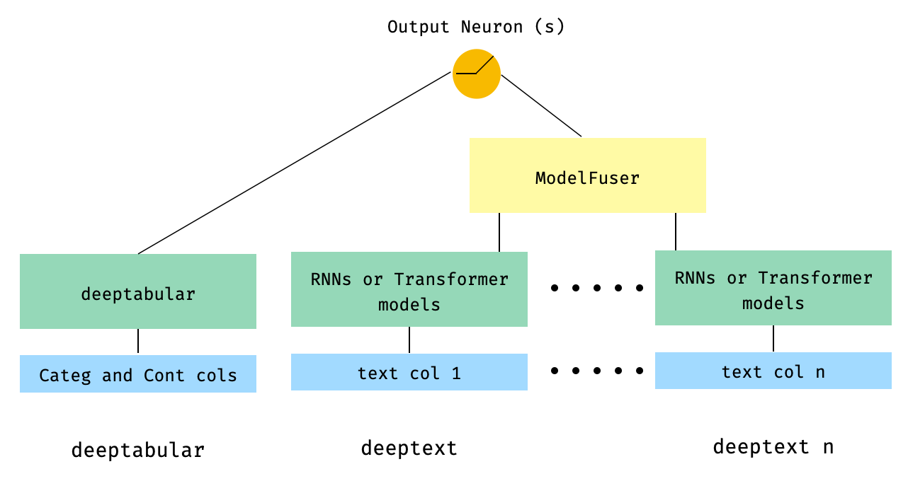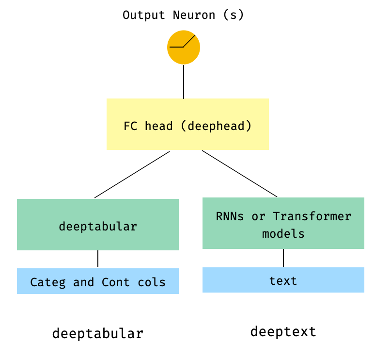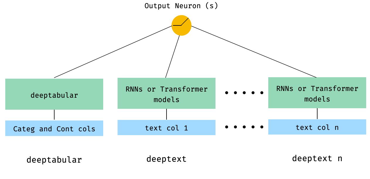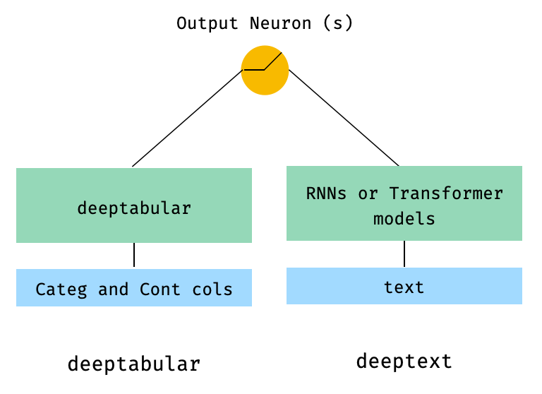 model = WideDeep ( deeptabular = tab_mlp , deeptext = [ rnn_1 , rnn_2 ])