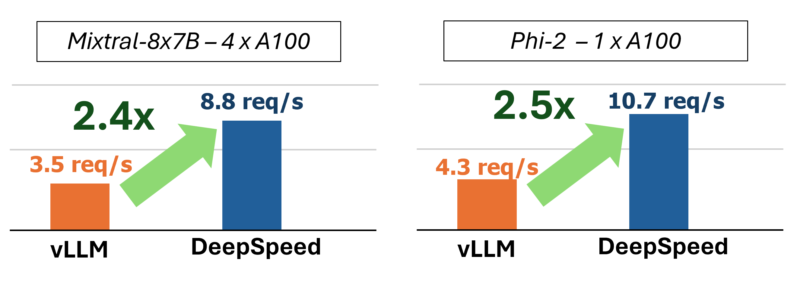 client = mii . serve ( "mistralai/Mistral-7B-v0.1" , tensor_parallel = 2 )Die resultierende Bereitstellung spaltet das Modell über 2 GPUs auf, um eine schnellere Inferenz und einen höheren Durchsatz zu liefern als eine einzelne GPU.