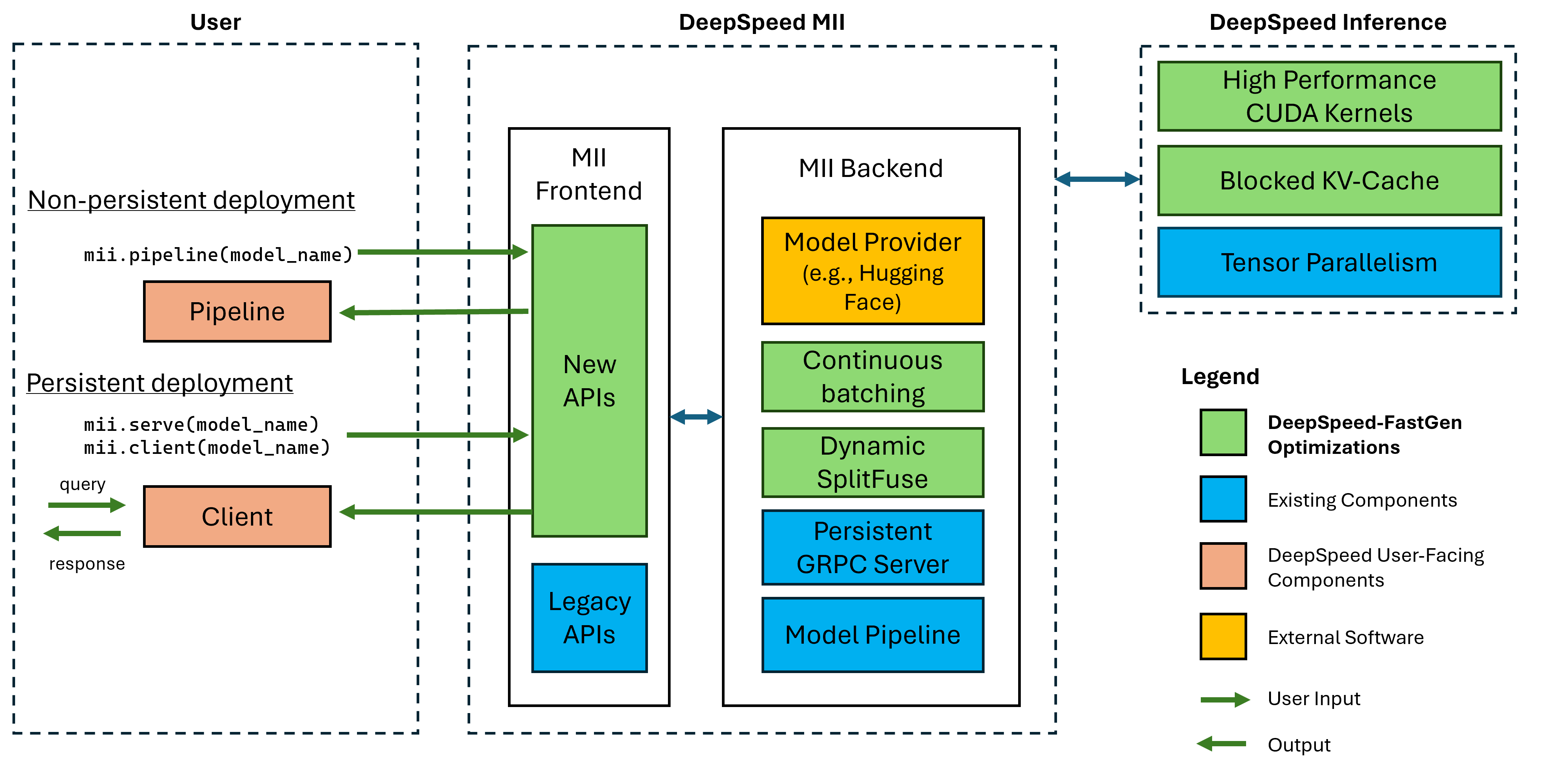 Abbildung 1: MII-Architektur und zeigt, wie MII OSS-Modelle automatisch mithilfe von DS-Inferenz optimiert, bevor sie bereitgestellt werden. In unserem Blog-Beitrag wurden Deepspeed-Fastgen-Optimierungen in der Figur veröffentlicht.