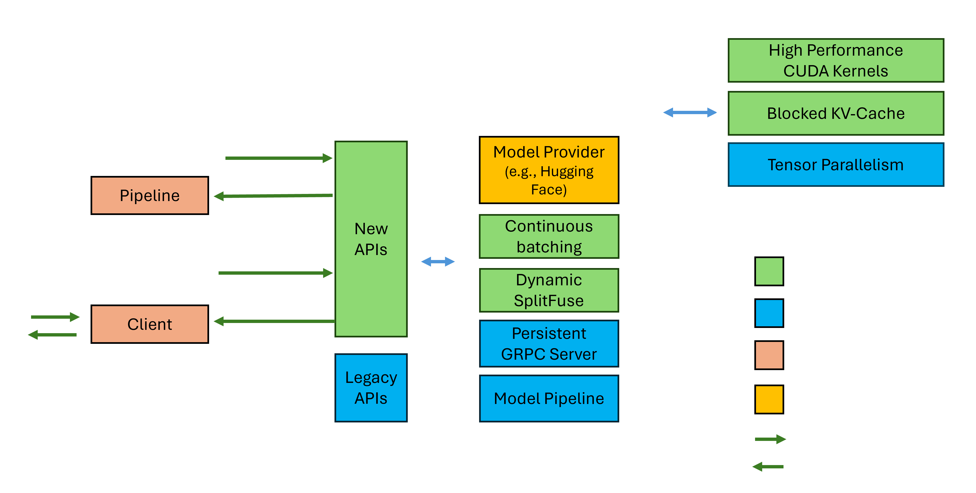 pip install deepspeed-miiFür die Benutzerfreundlichkeit und eine signifikante Verringerung der langen Kompilierungszeiten, die viele Projekte in diesem Bereich erfordern, verteilen wir ein vorkompiliertes Python-Rad, das den Großteil unserer kundenspezifischen Kernel über eine neue Bibliothek namens DeepSpeed-Kernels abdeckt. Wir haben festgestellt, dass diese Bibliothek über Umgebungen mit NVIDIA -GPUs mit Rechenfunktionen 8.0+ (Ampere+), CUDA 11.6+ und Ubuntu 20+ sehr tragbar ist. In den meisten Fällen sollten Sie nicht einmal wissen, dass diese Bibliothek existiert, da es sich um eine Abhängigkeit von DeepSpeed-MII handelt und damit installiert wird. Wenn Sie jedoch aus irgendeinem Grund unsere Kernel manuell kompilieren müssen, lesen Sie bitte unsere erweiterten Installationsdokumente.