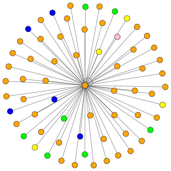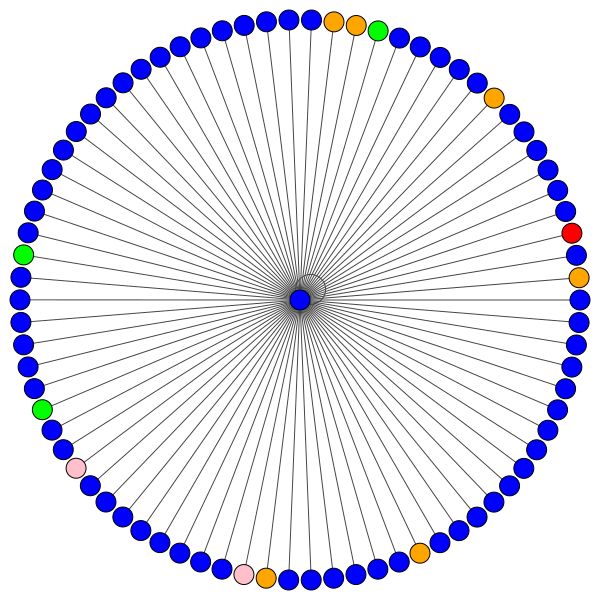 Dies ist einer von Coras Knoten, der die meisten Kanten (Zitate) hat. Die Farben repräsentieren die Knoten derselben Klasse. Sie können deutlich 2 Dinge aus dieser Handlung sehen: