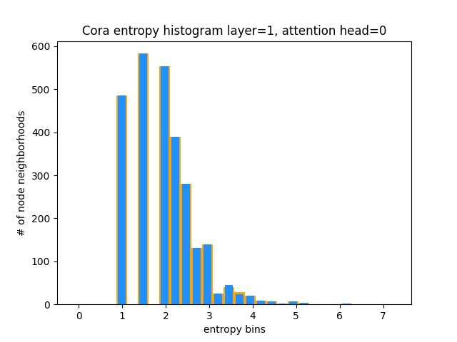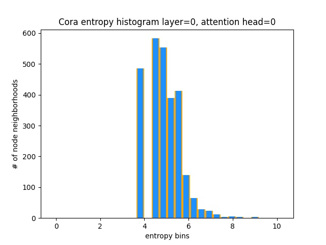 Eine andere Möglichkeit zu verstehen, dass Gat keine interessanten Aufmerksamkeitsmuster für Cora (dh, dass es Lernkonstant ist), besteht darin, die Aufmerksamkeitsgewichte des Knoten -Nachbars als Wahrscheinlichkeitsverteilung, die Berechnung der Entropie zu berechnen und die Informationen über die Nachbarschaft der einzelnen Knoten zu sammeln.