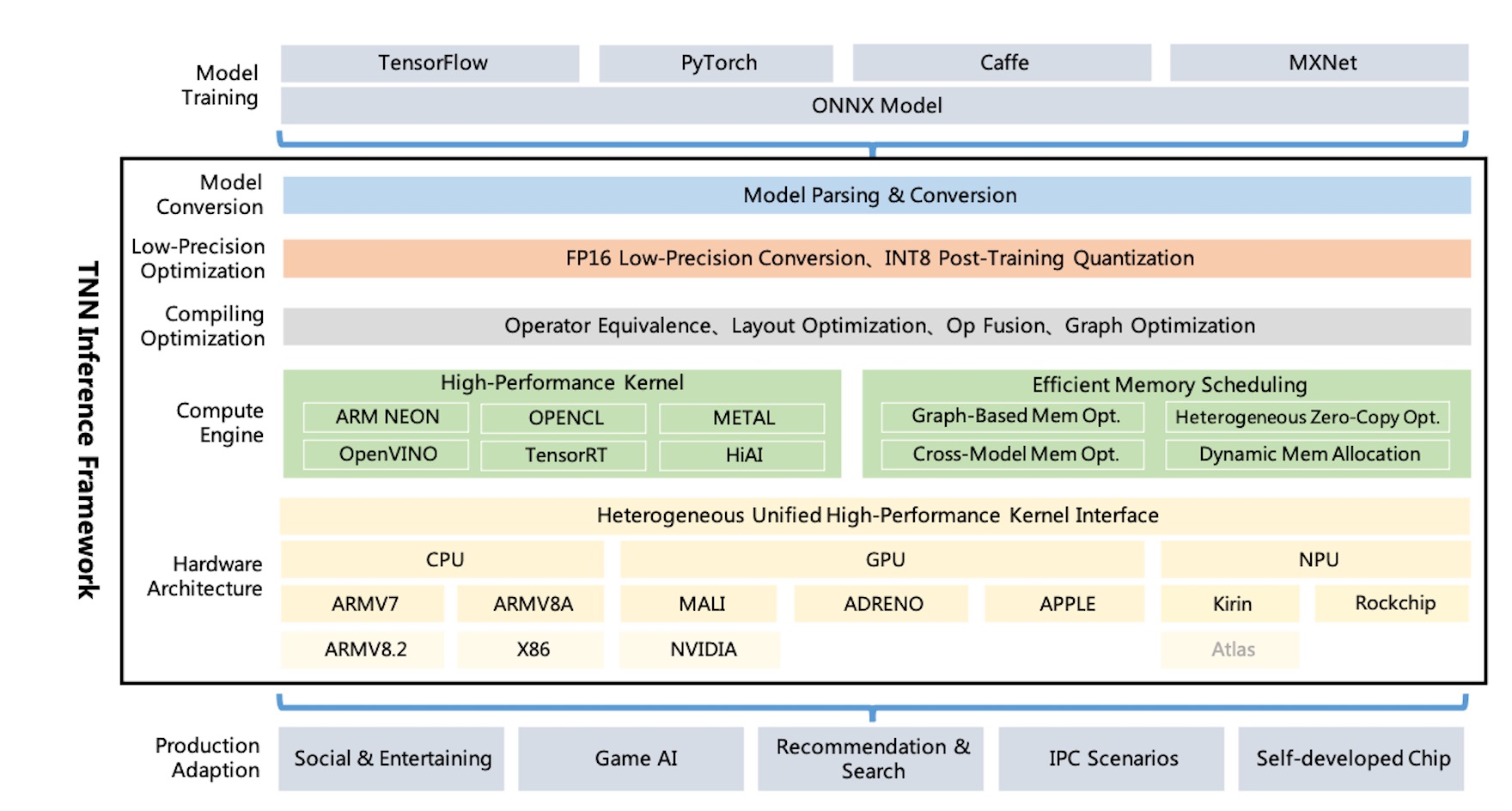 TNN wird durch modulares Design konstruiert, das Komponenten wie Modellanalyse, Diagrammkonstruktion, Diagrammoptimierung, Hardwareanpassung auf niedriger Ebene und Hochleistungskern abstrahiert und isoliert. Es verwendet "Werksmodus", um Geräte zu registrieren und zu erstellen, um die Kosten für die Unterstützung mehr Hardware- und Beschleunigungslösungen zu minimieren.