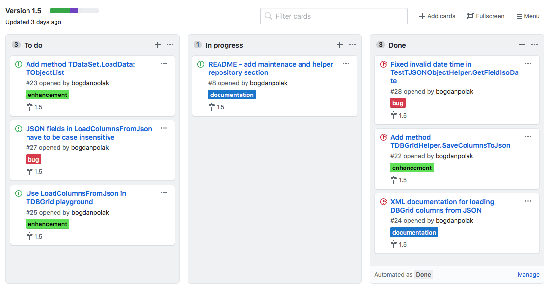 is021-grid-column-restore ist für neue Funktionen: Methode LoadColumnsFromJsonString in TDBGrid-Klasse-Helfer, mit der die in JSON String gespeicherte Spaltenkonfiguration (Auftrag, Titelbeschreibung, Breite und Sichtbarkeit) wiederhergestellt werden kann. Die Feature -Definition wird in GitHub Ausgabe #21 geschriebenis014-doc-dark-side ist ein neuer Dokumentationsabschnitt in der Hauptdatei main README.md .Klassenhelfer projizieren Kanban Board