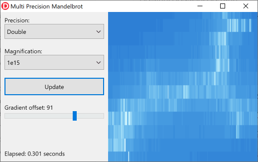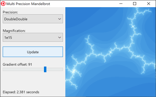 Ein unterhaltsamer Weg, um die Mathematik mit hoher Präzision zu demonstrieren, besteht darin, den Mandelbrot-Fraktal zu berechnen. Wenn Sie in den Fraktal vergrößern, brauchen Sie immer mehr Präzision. Das Proben -Unterverzeichnis enthält eine Fironemonkey -Anwendung, die das Mandelbrot -Fraktal bei 4 Präzisionsniveaus erzeugt ( Single , Double , DoubleDouble und QuadDouble ).