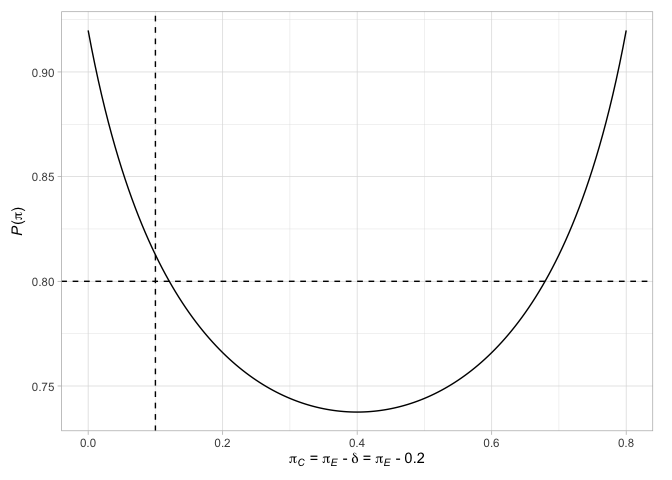 # > # N` <int>Schließlich können wir verschiedene Faktoren in Bezug auf die Designs zeichnen. Zeichnen Sie beispielsweise die Terminalpunkte des Jung (2008) -Desende (mit ihren zugehörigen Entscheidungen) zusammen mit der Wahrscheinlichkeit, die Nullhypothese abzulehnen, wenn die Reaktionswahrscheinlichkeiten in den beiden Armen gleich sind oder wenn die Differenz der Reaktionswahrscheinlichkeiten der gewählte Behandlungseffekt ist