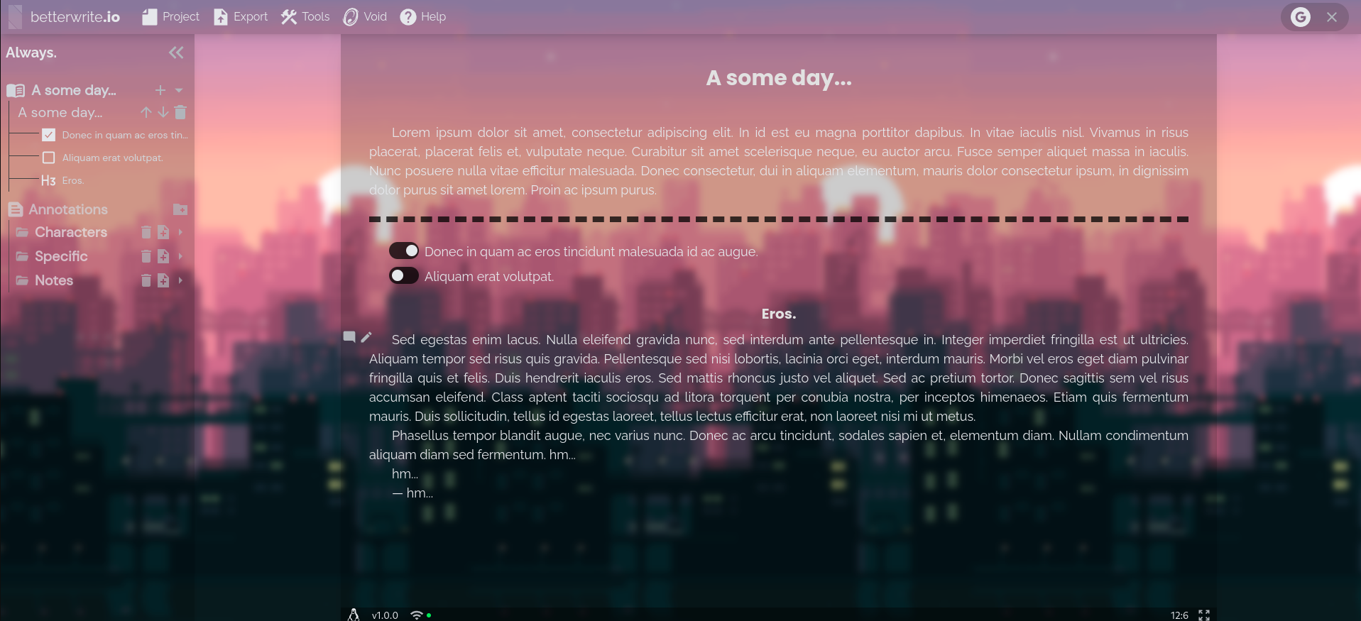 Vollständige Anpassung : Der Herausgeber ist vollständig anpassbar, um die Kreativität des Schriftstellers zu betonen und den gesamten Kontext anzupassen. Zusätzlich zu Standardthemen ermöglicht BetterWrite benutzerdefinierte Hintergründe (einschließlich GIFs ) und die Verwendung externer Schriftarten innerhalb des Editors selbst.