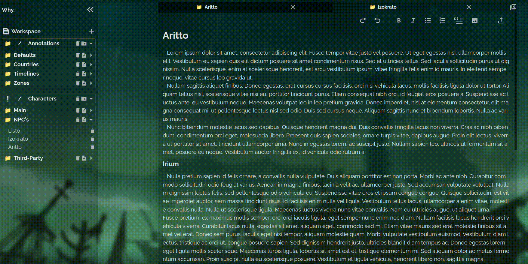 Charaktere sind ein System, um bestimmte Wörter zu identifizieren und eine gewisse Kontrolle über sie anzubieten, wodurch der Absatz mit Farben und deren Auftreten im Projekt hervorgehoben wird. Mit diesem System können Fantasy- oder Drama -Autoren hauptsächlich die Kontrolle über ihre Absätze haben und mit Charakterbögen mit Perfektion umgehen.