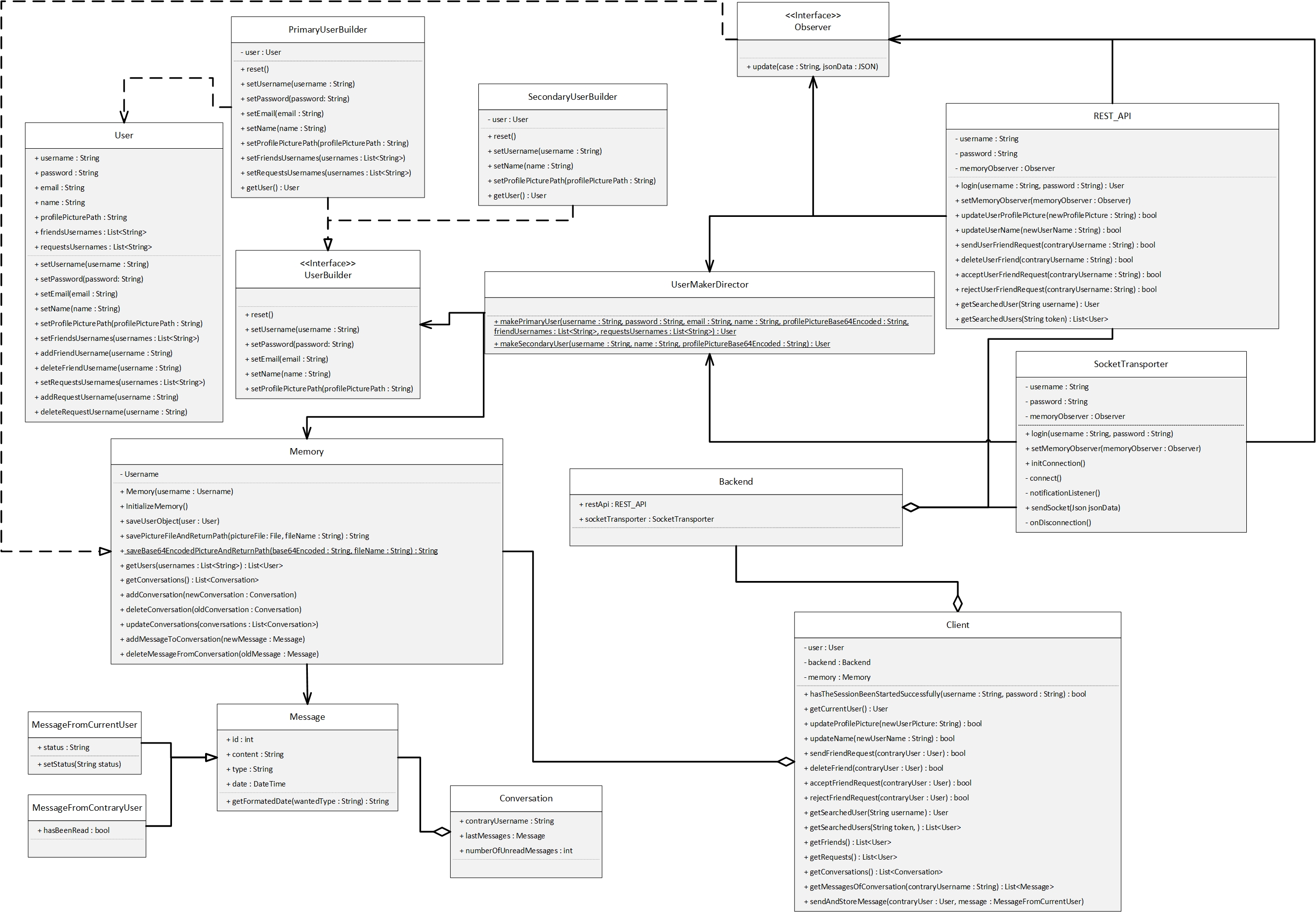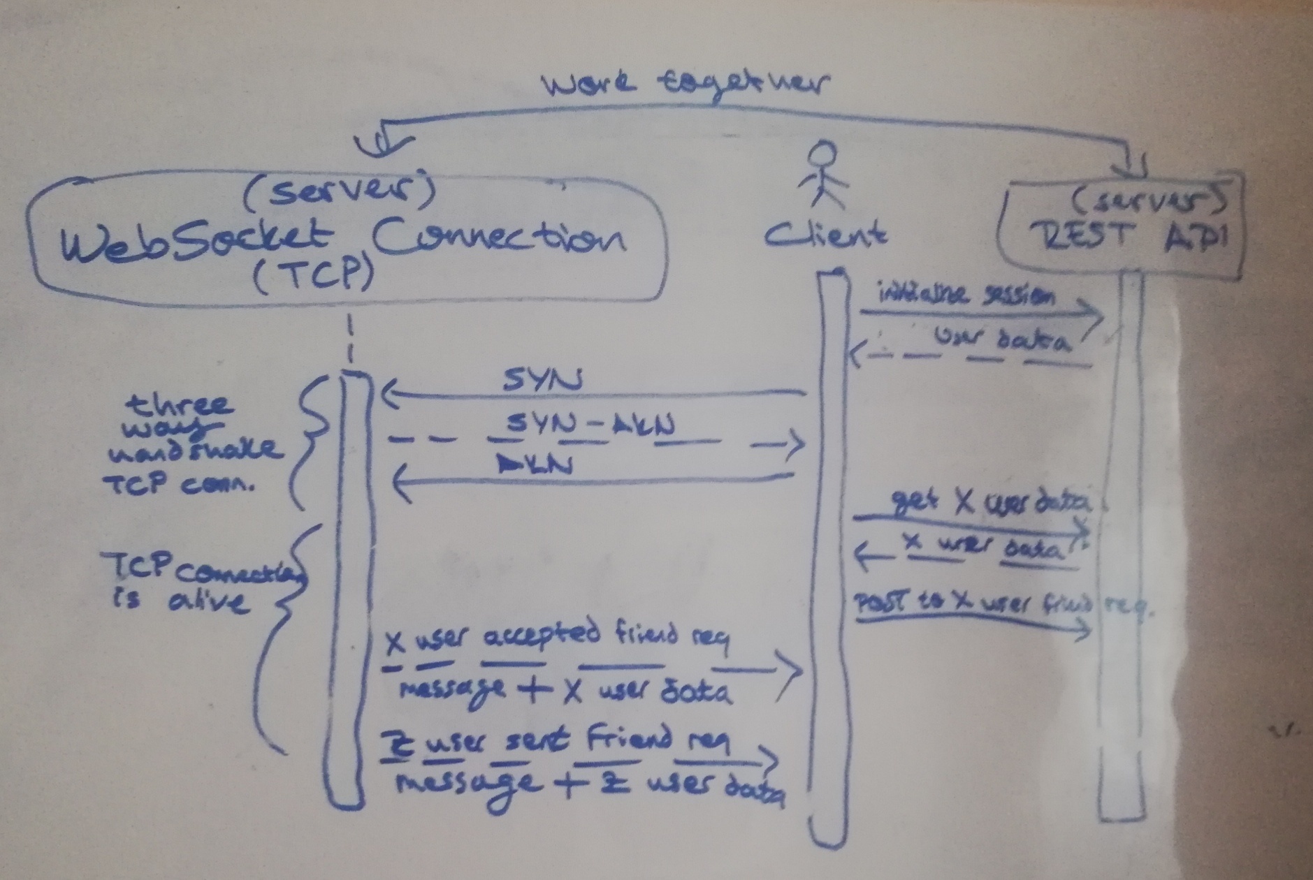 Echtzeit-Vorgänge wie das Senden von Nachrichten und Freundschaftsanfragen verwenden WebSockets, während Vorgänge wie das Öffnen einer Sitzung und die Aktualisierung der Daten eines Benutzers die REST-API verwenden.