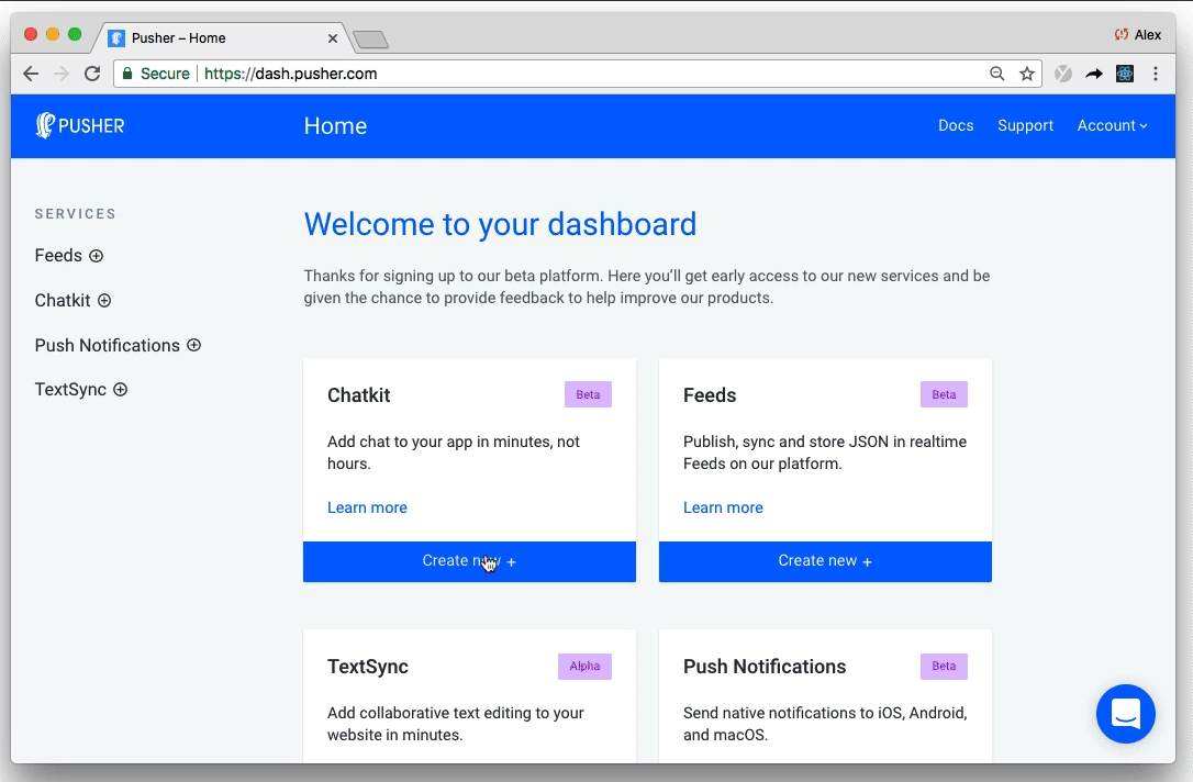 Um eine eigene Chatkit -Instanz zu erstellen, besuchen Sie das Dashboard und klicken Sie auf Neue: Neu :