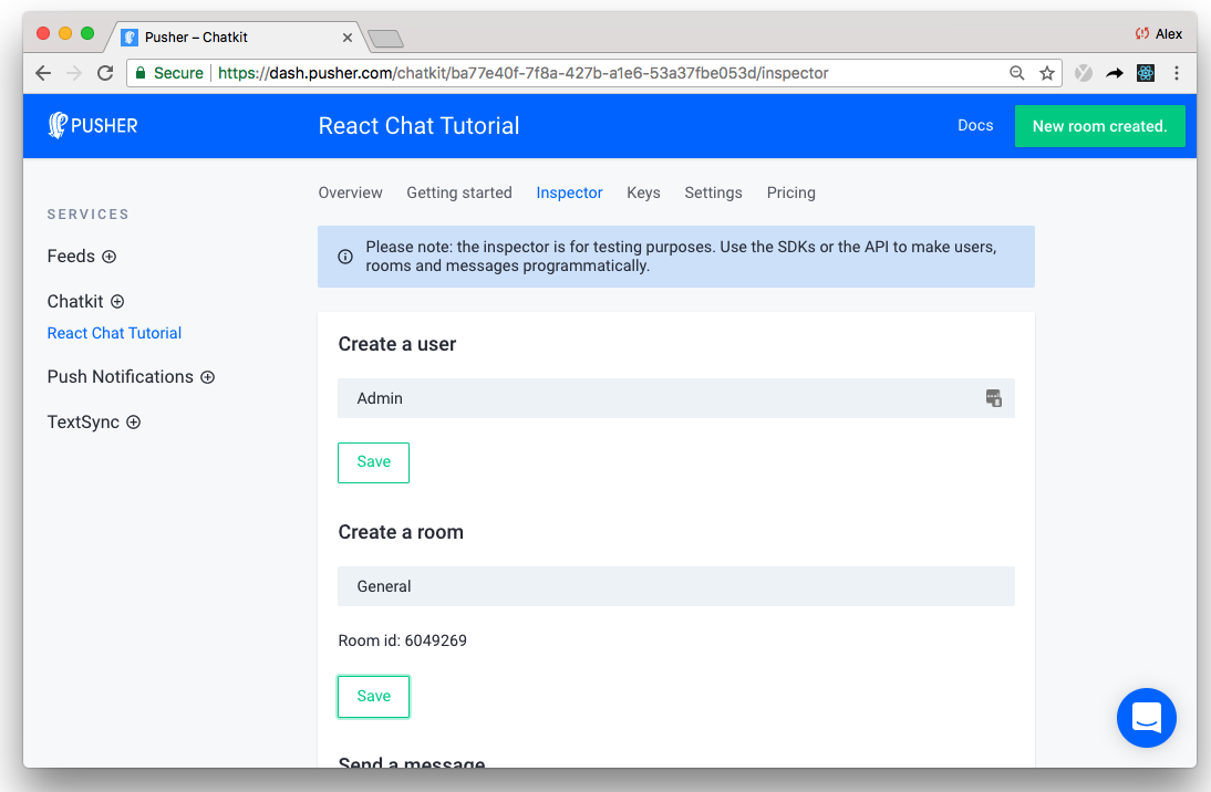 Geben Sie Ihrer Instanz einen Namen (ich nannte mein "React Chat -Tutorial") und beachten Sie dann Ihren Instanz -Locator und Ihre geheime Schlüssel in der Registerkarte Tasten. Wir brauchen sie beide im nächsten Abschnitt.