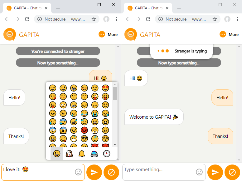 Einfachheit - KEIN Login: Keine Anmeldung oder Registrierung erforderlich, um online in Gapita zu chatten. Anonym mit zufälligen Fremden zu chatten, ist ein Klick. Sie brauchen kein Konto, um mit jemandem zu chatten.