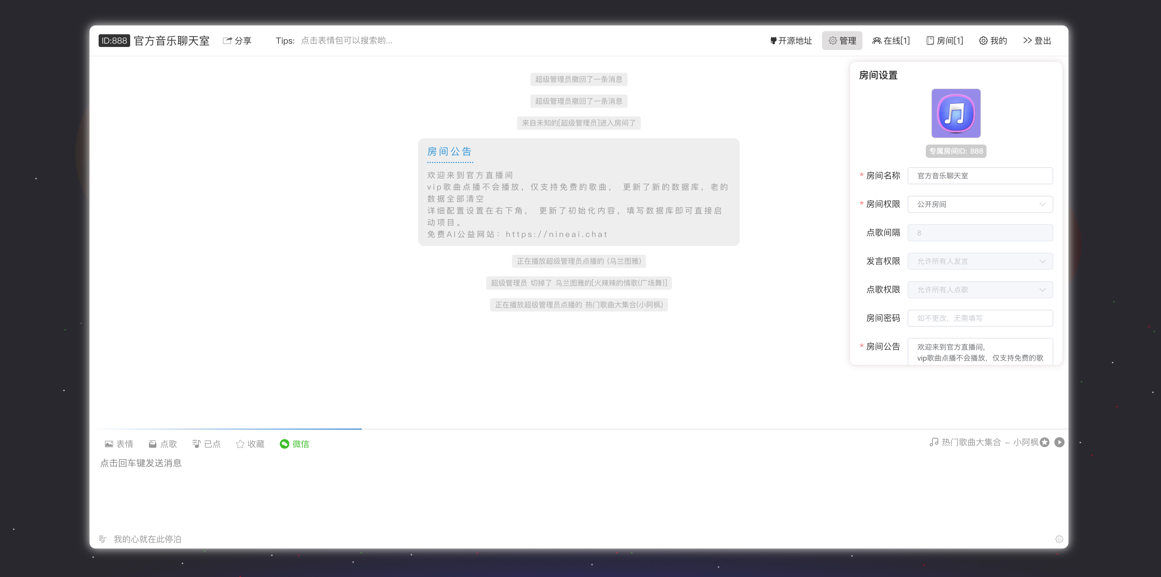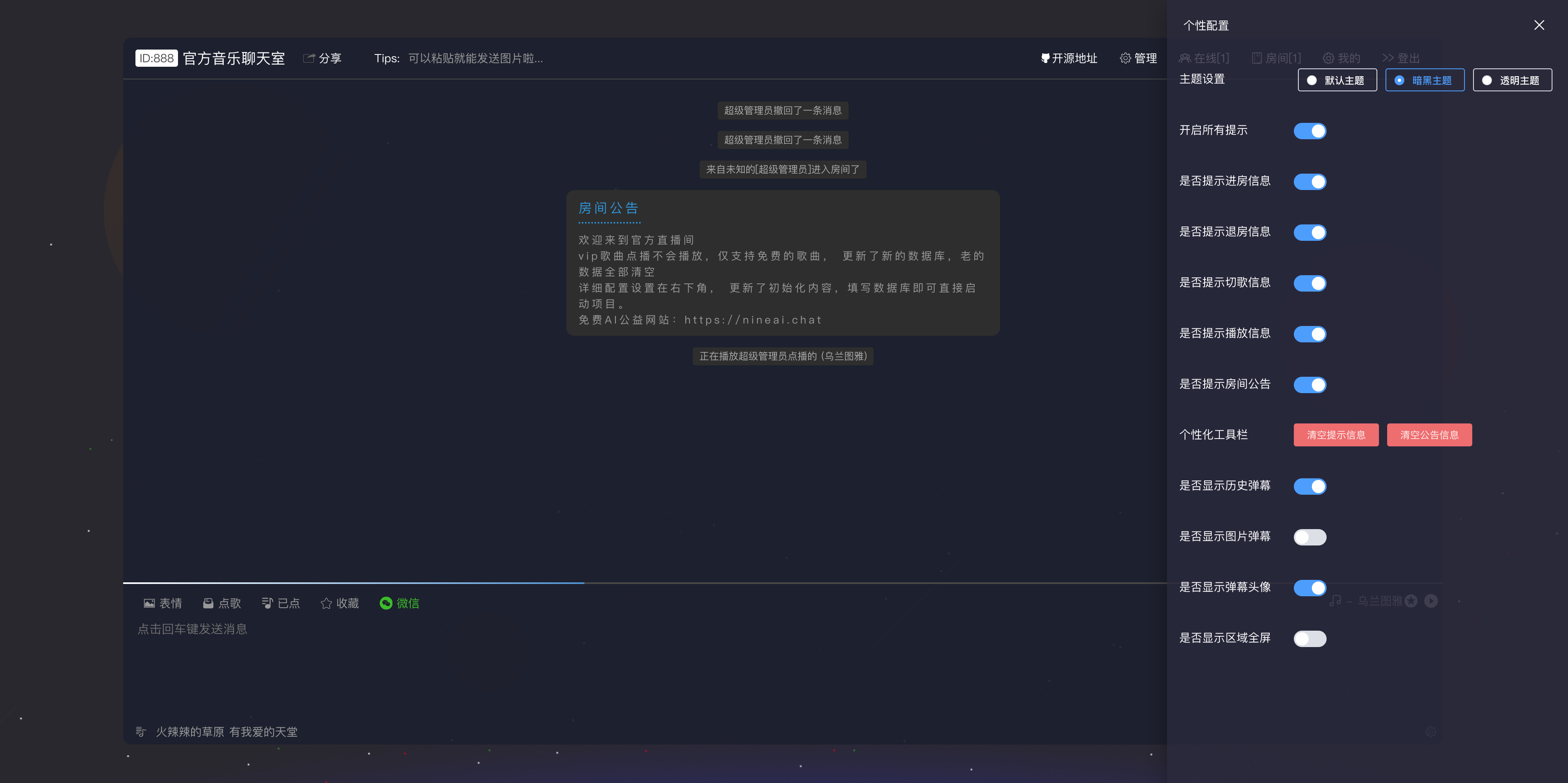 1.新增个人私有房间,支持用户创建自己独立的房间了