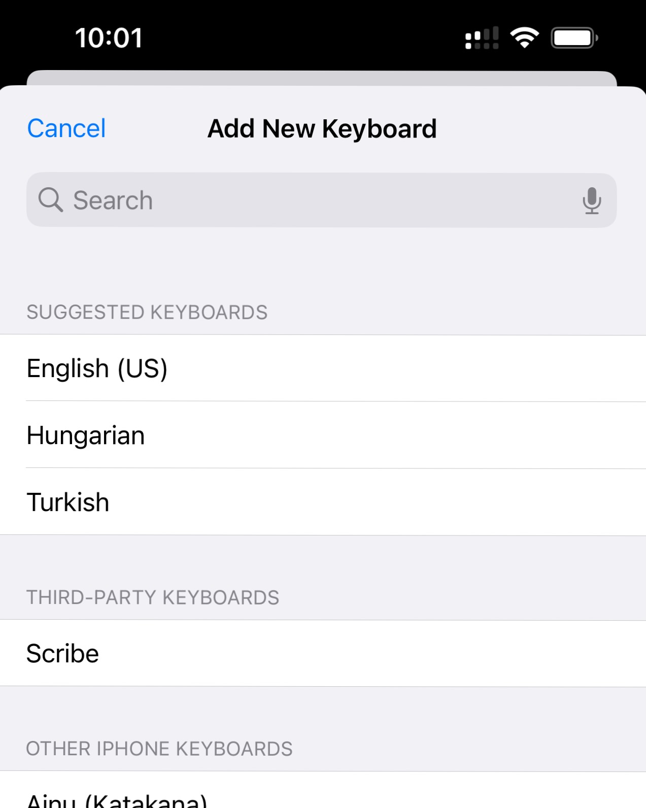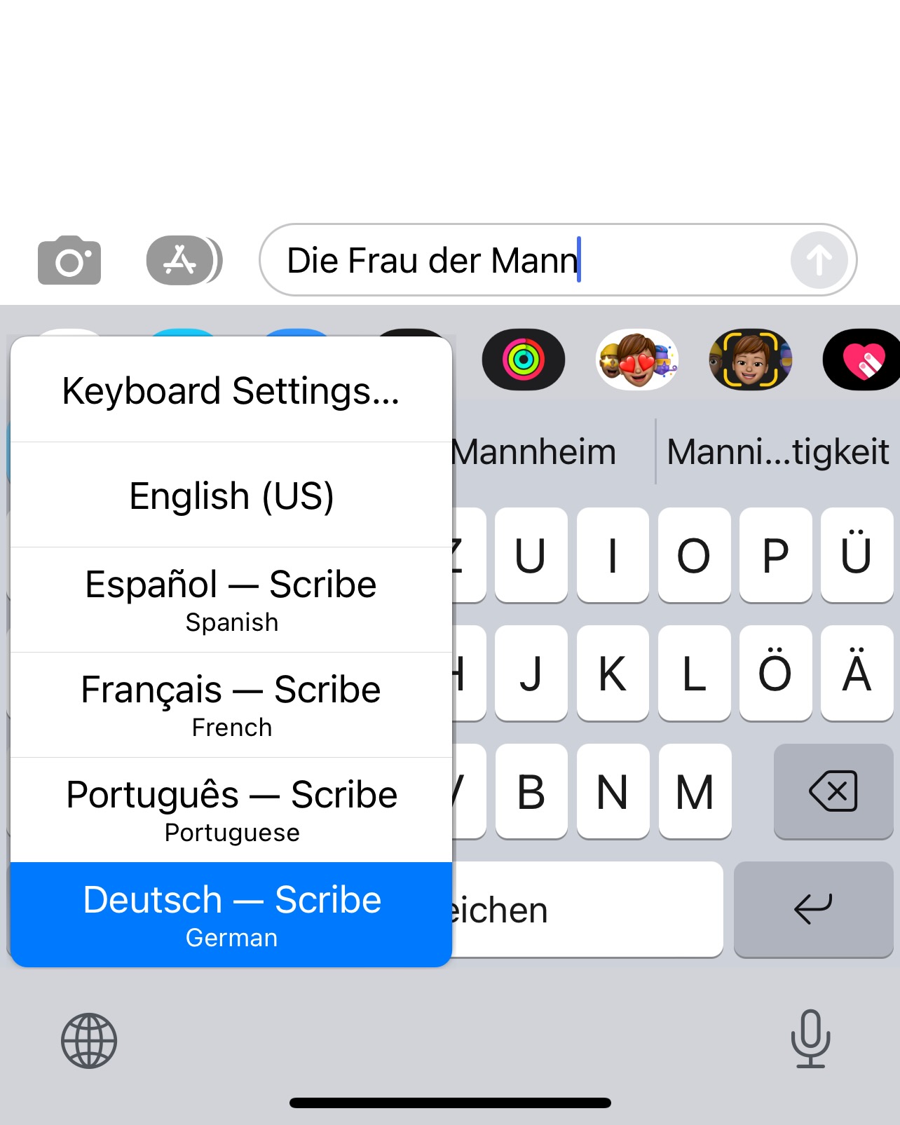 Scribe-ios ist ein Paket iOS und iPados-Tastaturen für Sprachlernende. Zu den Merkmalen gehören Translation (beta) , Verbkonjugation und Word -Annotation, die den Benutzern die Tools geben, die zur Kommunikation mit Vertrauen erforderlich sind.