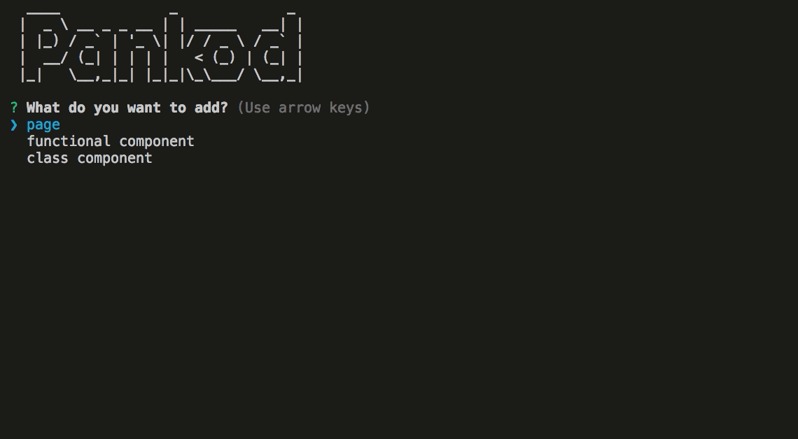 Mit einem interaktiven Menü können Sie nach dem Start die zu erstellende Komponente konfigurieren. Zunächst werden Sie nach dem Typ der Komponente gefragt, ob es sich um eine Seite oder eine funktionale Komponente handelt. Anschließend werden Sie mit den anderen Optionen aufgefordert, die für Ihre Auswahl relevant sind.