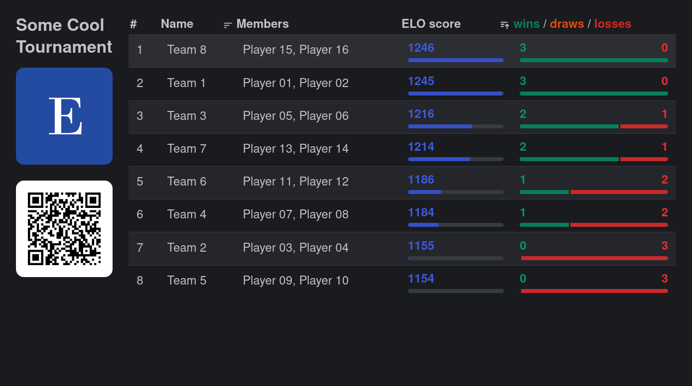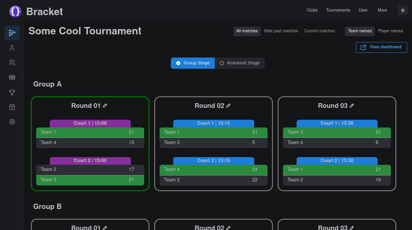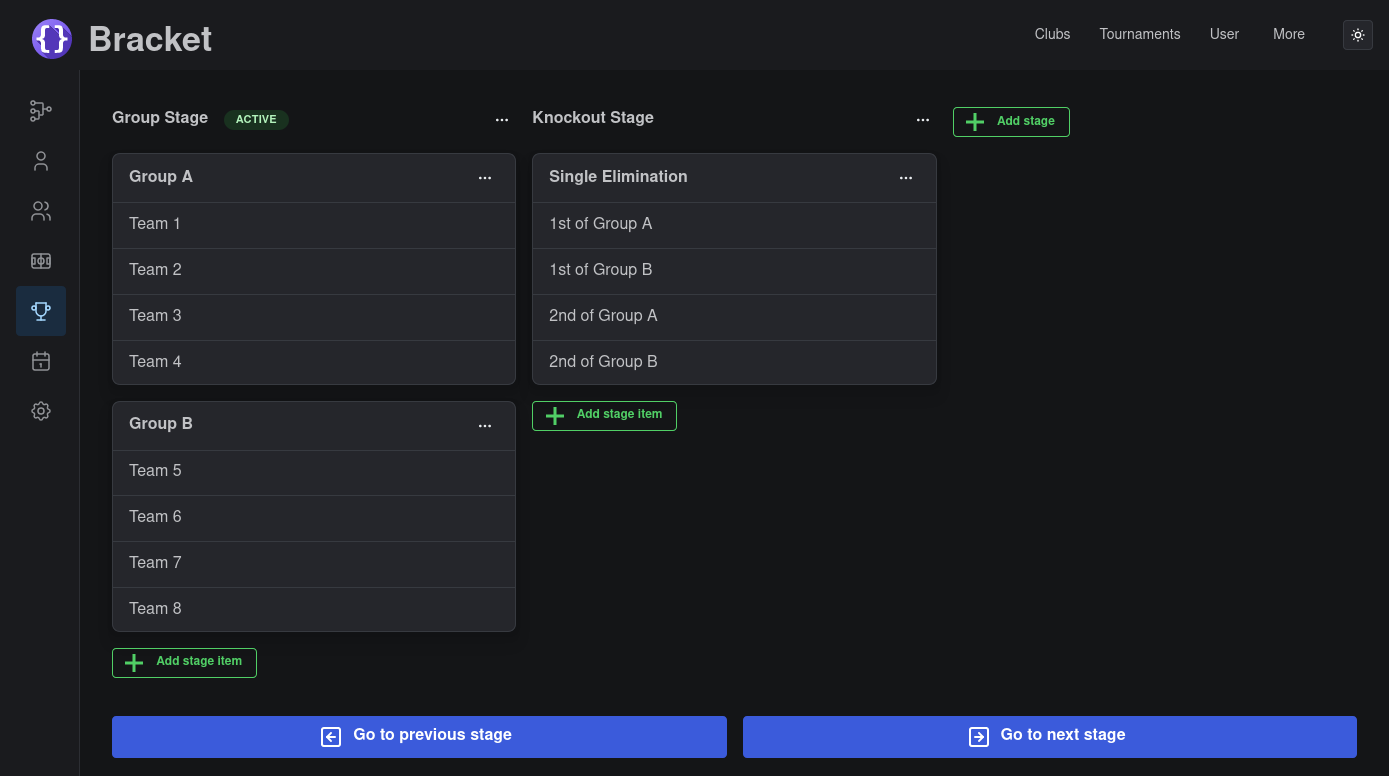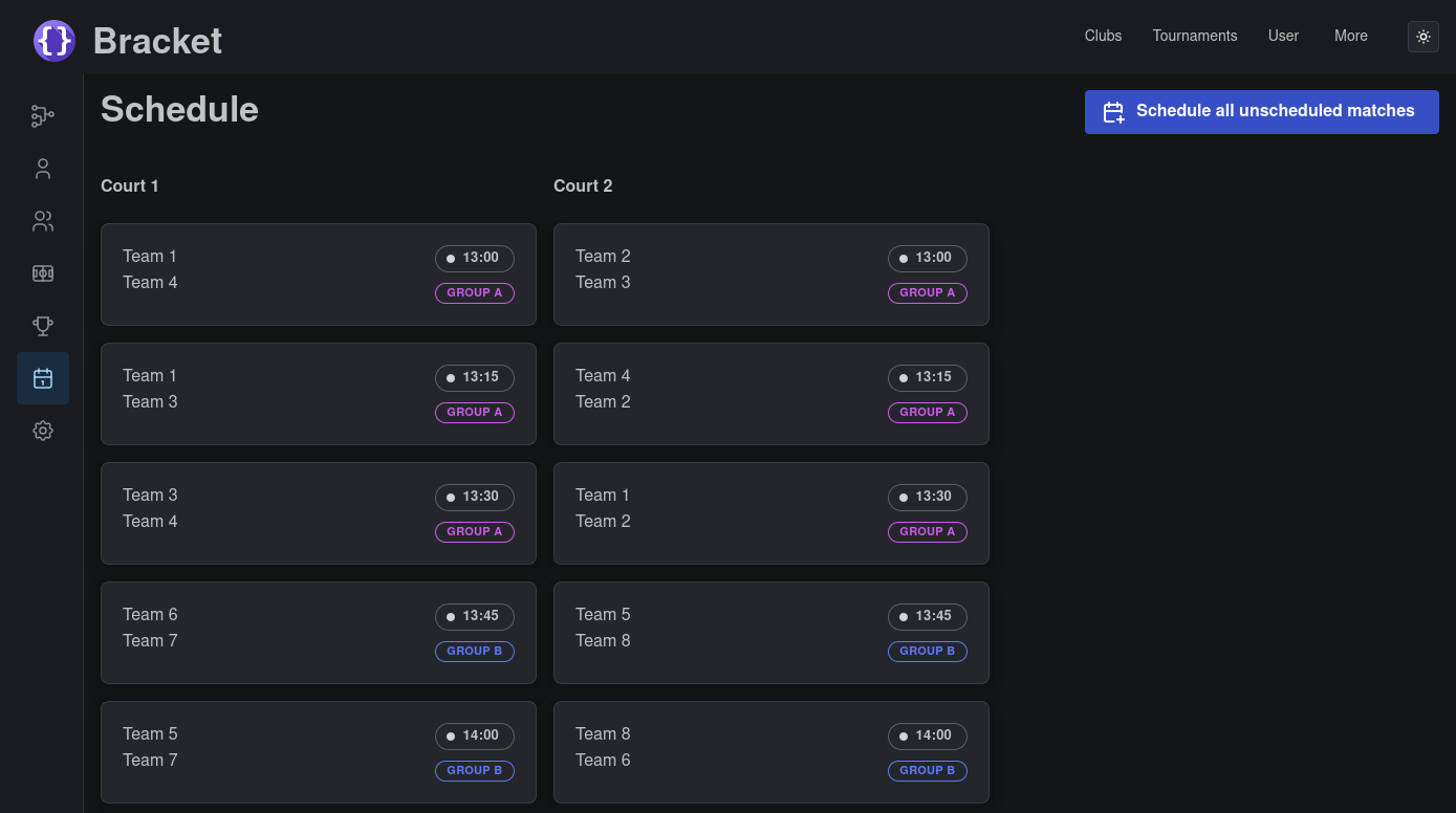 Turniersystem, das einfach zu bedienen ist. Bracket ist in Async Python (mit Fastapi) und Next.js als Frontend mit der Mantinenbibliothek geschrieben.