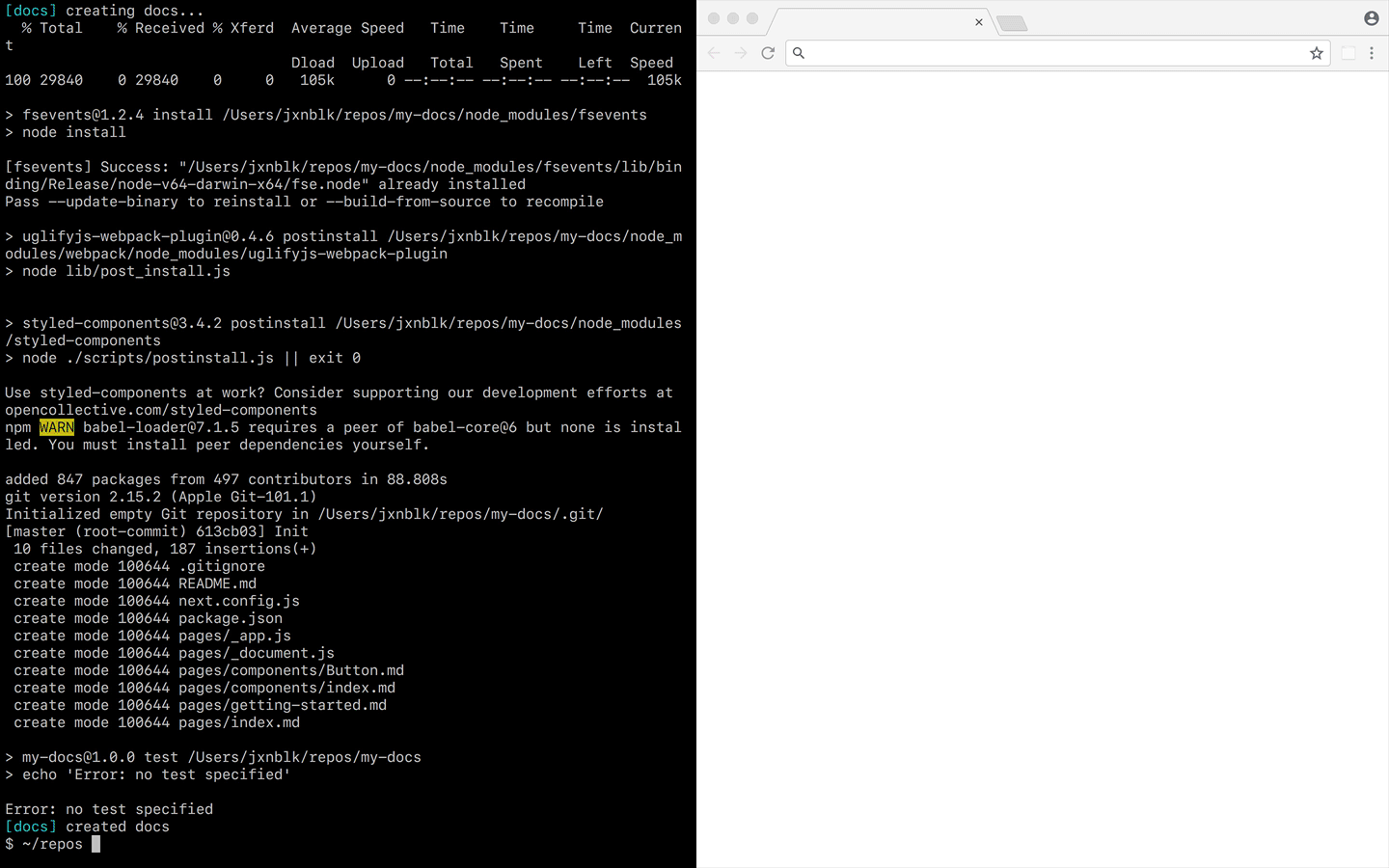 npm init docs Um eine neue Dokumentationsseite zu erstellen, führen Sie npm init docs aus und befolgen Sie die Eingabeaufforderungen. Sobald die Anwendung generiert wurde, finden Sie im Readme.md weitere Dokumentation.