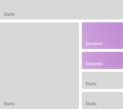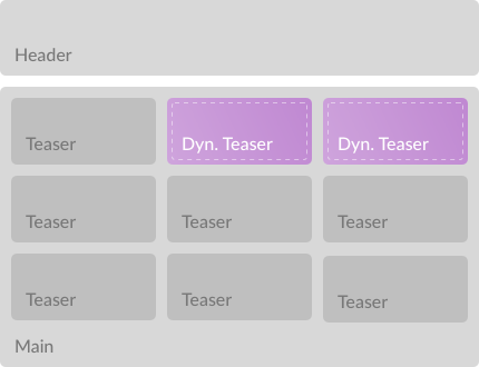 Lassen Sie uns dies mit gutem Beispiel erklären. Angenommen, Sie haben eine nächste App mit einem header , einem main und teaser (das beispielsweise nur Bilder mit einem Text und einer Überschrift sein kann). Für dieses Beispiel versuchen wir, die Teaser 2 und 3 dynamisch zu machen (nur um einige Elemente auf der Seite auszuwählen) und den Rest statisch zu lassen.