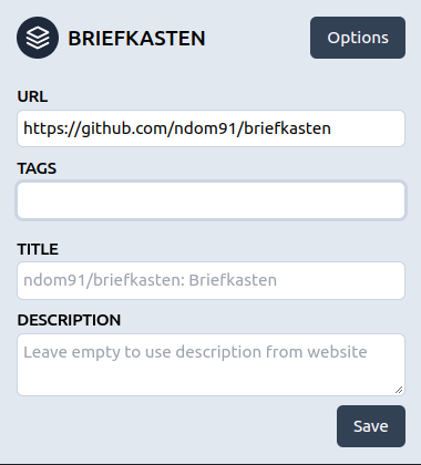 Es gibt eine Begleitbrowser -Erweiterung in den Arbeiten, mit der Sie Ihrem Gewölbe Websites hinzufügen können, während Sie das Web durchsuchen. Es kann in ndom91/briefkasten-extension und im Chrome-Erweiterungsgeschäft gefunden werden. Weitere Details in diesem Repository.