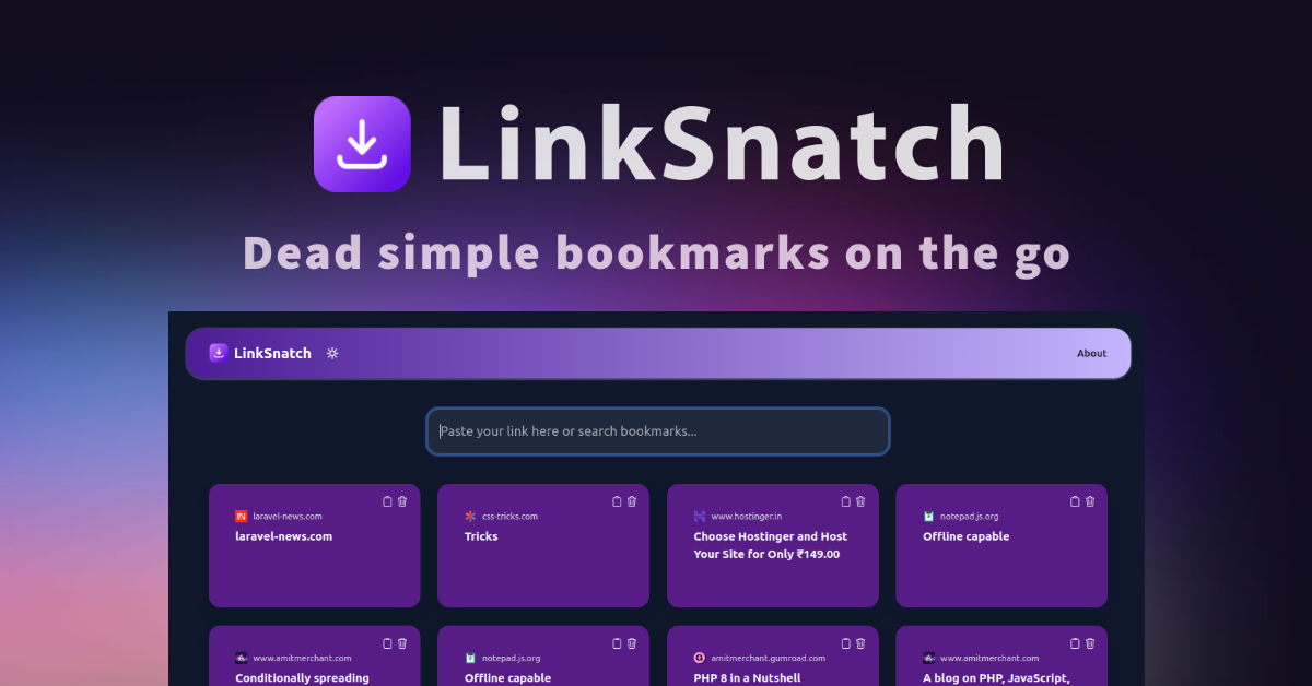 Ich habe Linksnatch erstellt, weil ich etwas wirklich Einfaches wollte, um Links zu speichern, die ich später lesen wollte. Ich wollte mich nicht für ein Konto anmelden müssen, ich wollte keine Browser -Erweiterung installieren müssen, und ich wollte keinen Lesezeichendienst verwenden, der mich verfolgen würde. Ich wollte etwas ziemlich Einfaches, das nur funktioniert. Und hier bin ich!