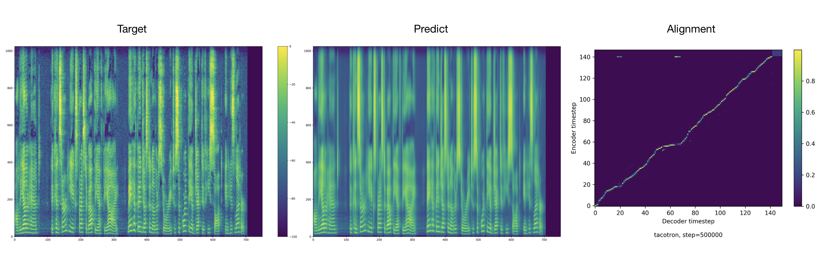 Der Trainer entfällt standardmäßig Audio und Ausrichtungen alle 2000 Schritte. Sie finden diese in tacotron/ckpt/ .