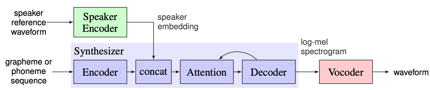 Wir wählen die von den Ausbildern vorgeschlagene Lösung als Basislinie, die hier zu finden ist. Es handelt sich um die Implementierung von [1] in Google im Jahr 2018. Hier verwenden Autoren den in [2] dargestellten Sprecher-Encoder, der einen festgelegten Einbettungsvektor generiert, der als D-Vektor bekannt ist. In Bezug auf Synthesizer verwenden sie ein Modell basierend auf Tacotron 2 [3], während ein automatisch-regressives Wellenetbasis als Vocoder verwendet wird [4]. Das folgende Bild aus [1] stellt den Modellüberblick dar:
