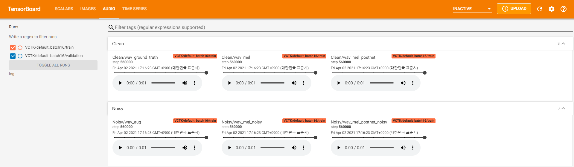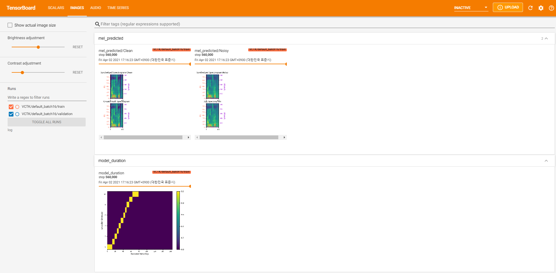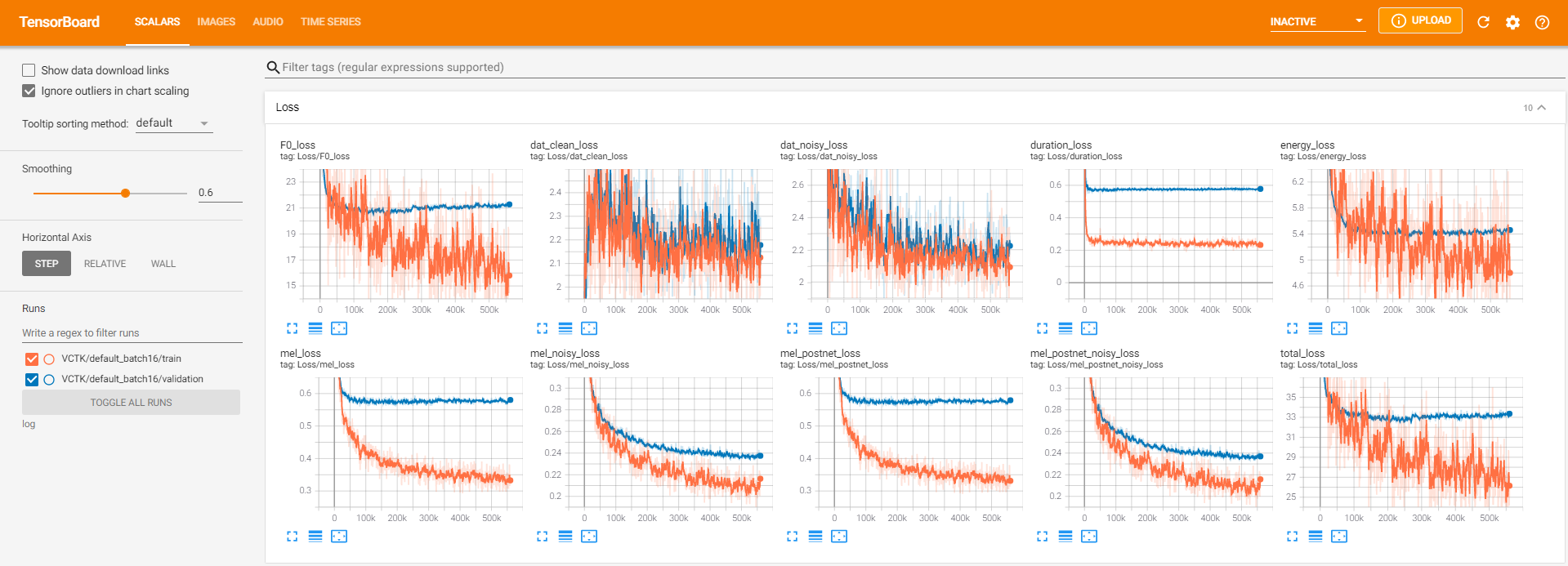 tensorboard --logdir logum das Tensorboard auf Ihrem örtlichen Haus zu servieren. Hier finden Sie einige Protokollierungsansichten des Modelltrainings auf VCTK für 560K -Schritte.