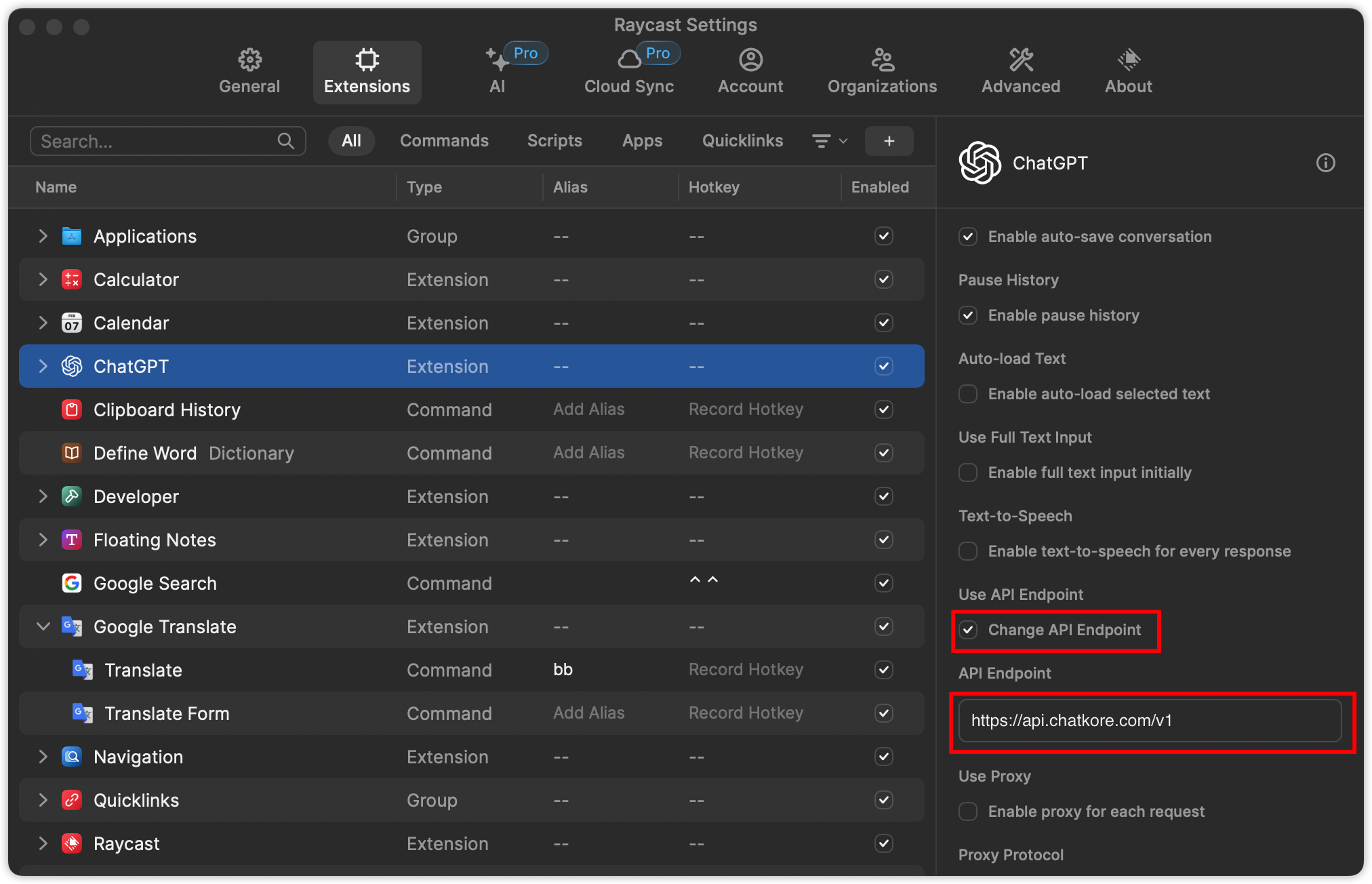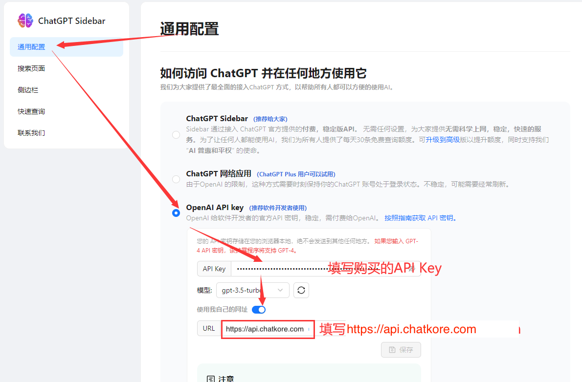 Geben Sie nach der Installation des Plug-Ins die Einstellungsseite ein, ändern Sie die Einstellungen wie in der Abbildung gezeigt und ändern Sie die URL an https://api.chatkore.com .