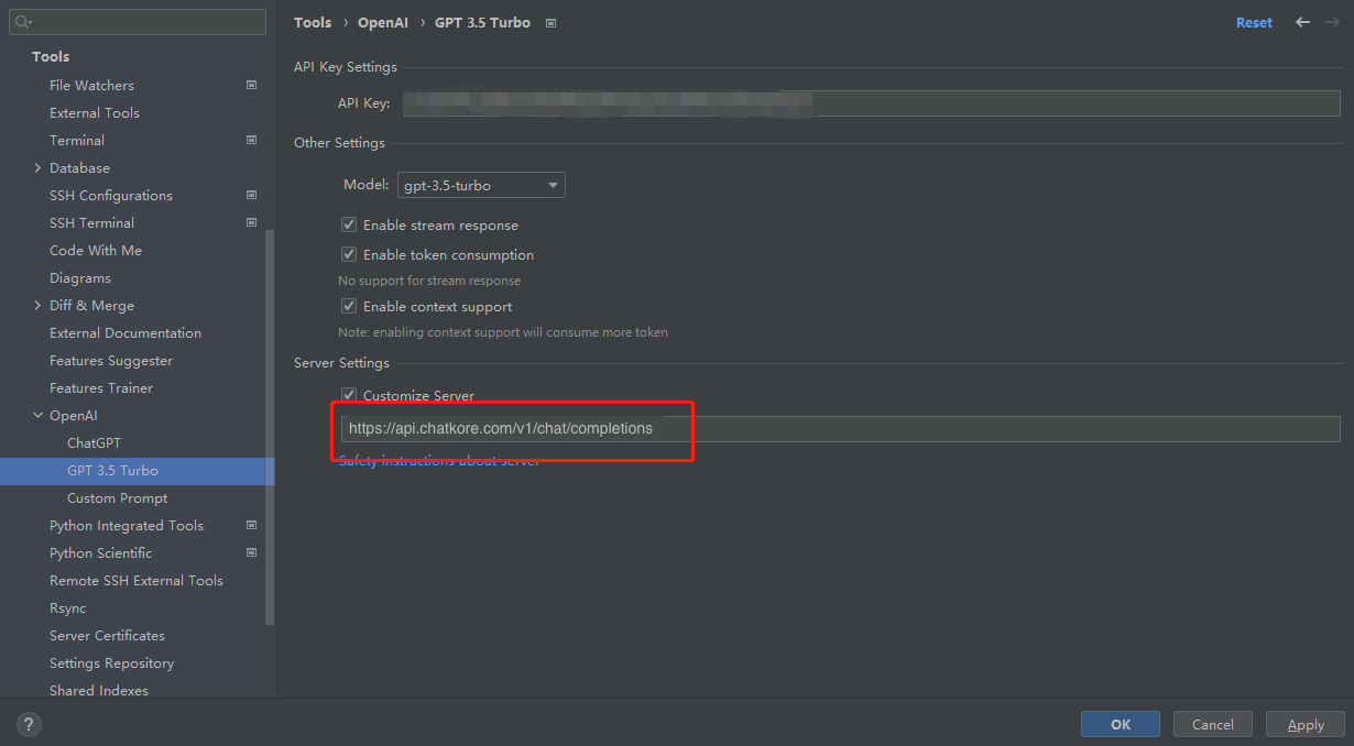 Konfigurieren Sie nach der Installation des Plug-Ins das Plug-In in Einstellungen> Tools> OpenAI> GPT 3.5 Turbo, wie in der Abbildung gezeigt. Der Schlüssel besteht darin, die Servereinstellungen auf https://api.chatkore.com/v1/chat/completions zu ändern. Und überprüfen Sie den Server anpassen.
