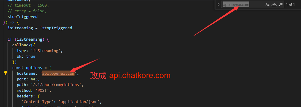 Geben Sie nach dem Öffnen die offene Datei ein ./src/clients/openai_client.js, suchen Sie in der Datei nach api.openai.com und ersetzen Sie sie durch api.chatkore.com . Speichern Sie die Datei.