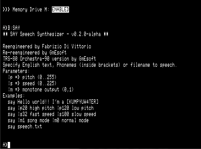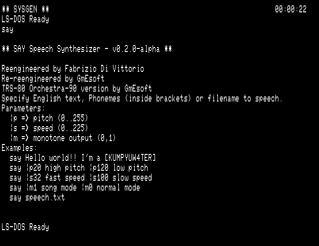 Dies ist ein SAM-basierter Text-zu-Sprach-Sprachsynthesizer für CP/M und LS-DOS 6.3. Angepasst, um am TRS-80 Modell 4 (P) mit dem Orchester-90-Schalladapter zu arbeiten.