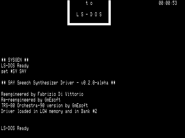 Basierend auf real.com für Bondwell 12/14 und auf einer verbesserten Version Say.com von Fabrizio di Vittorio wurde es weiter überarbeitet, um die Größe der ausführbaren Binärdatei zu verringern und es auf TRS-80-Modell 4 mit Orchester-90 zu portieren.