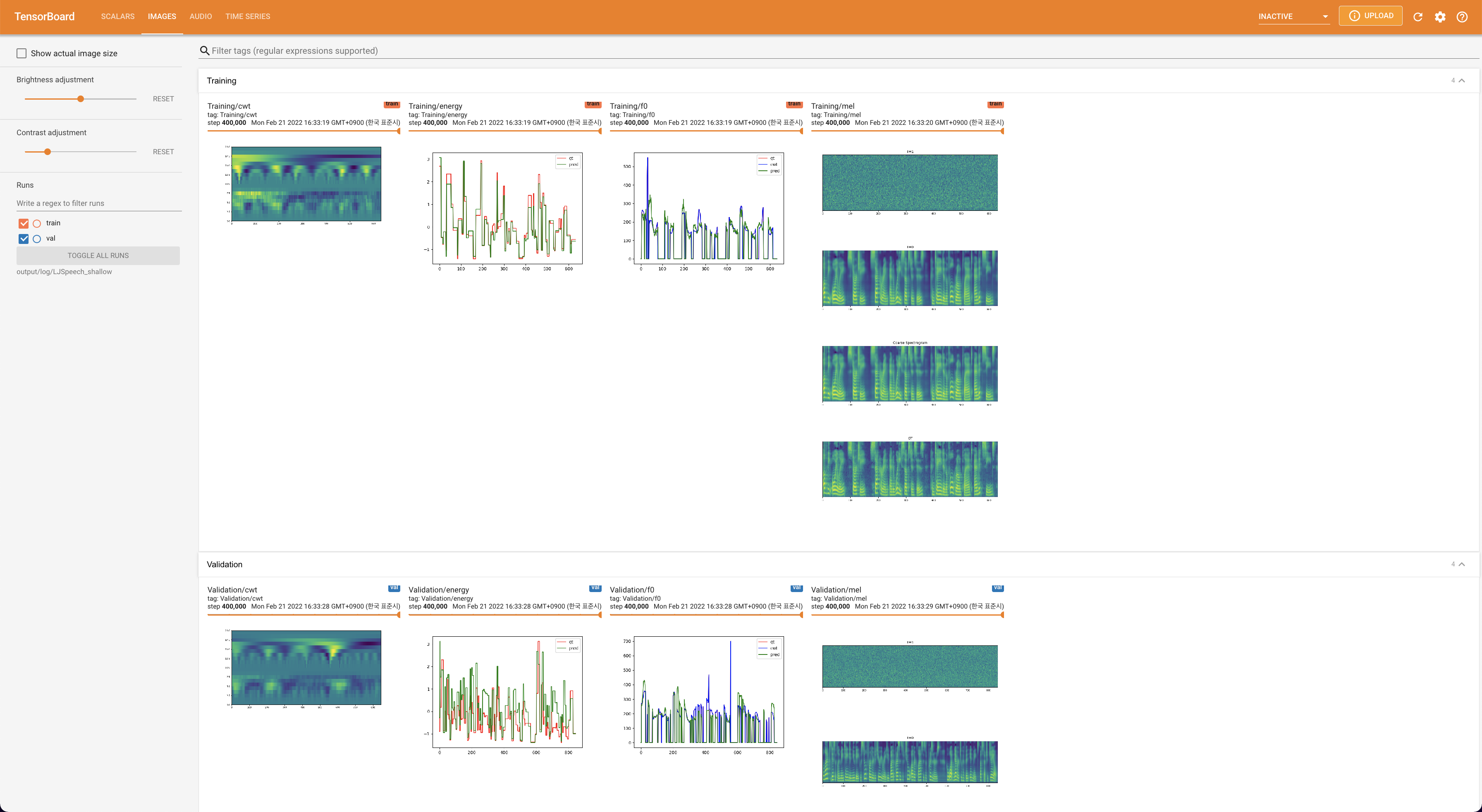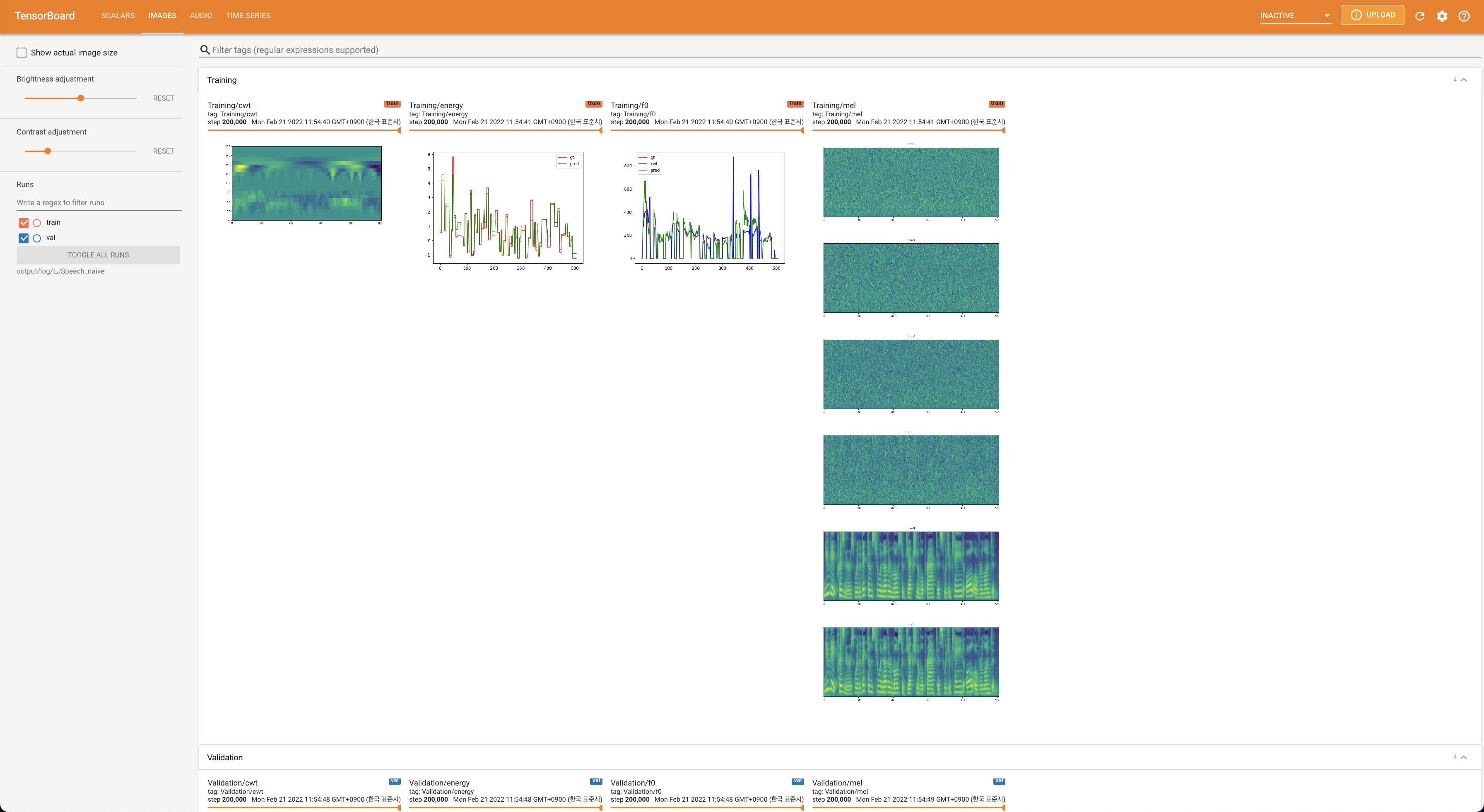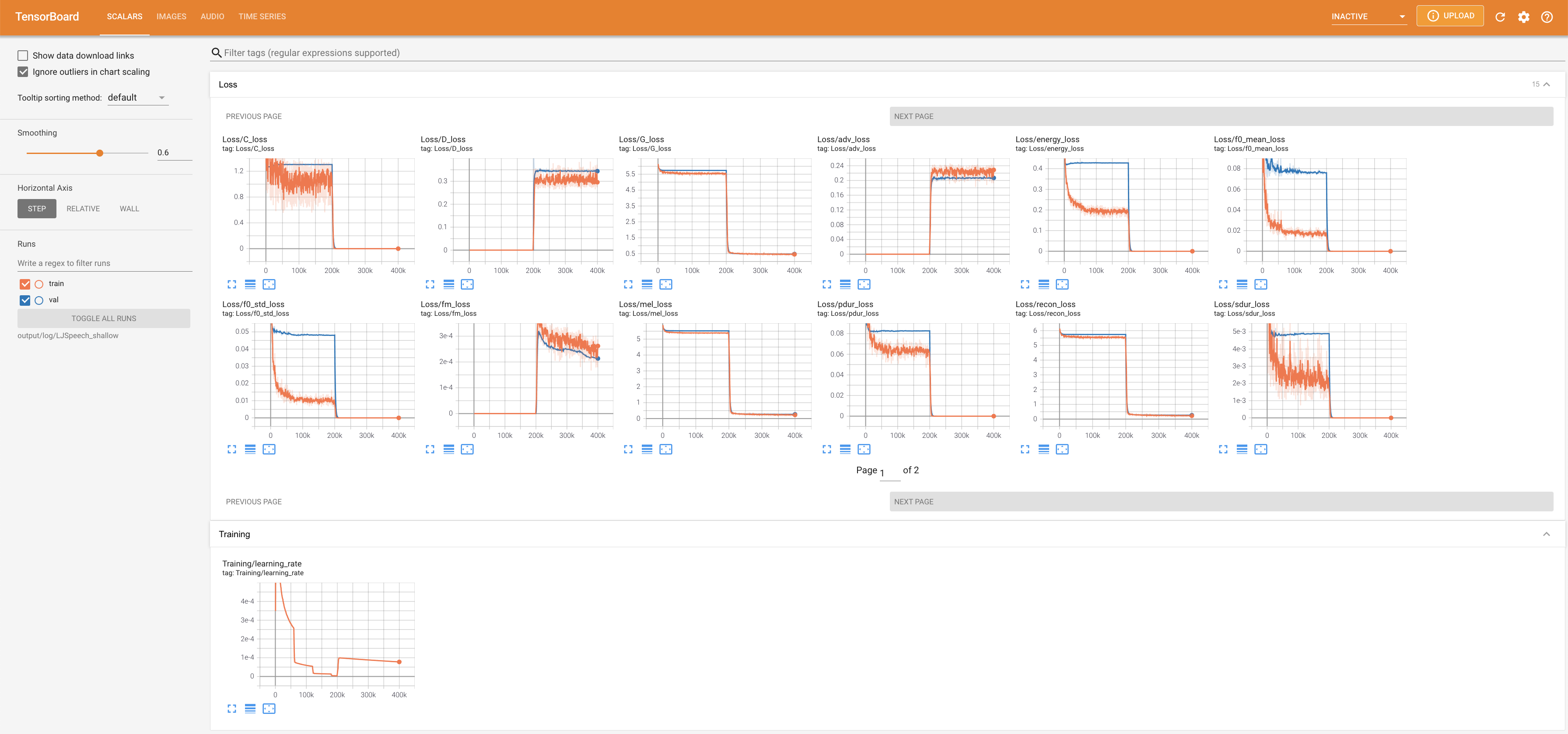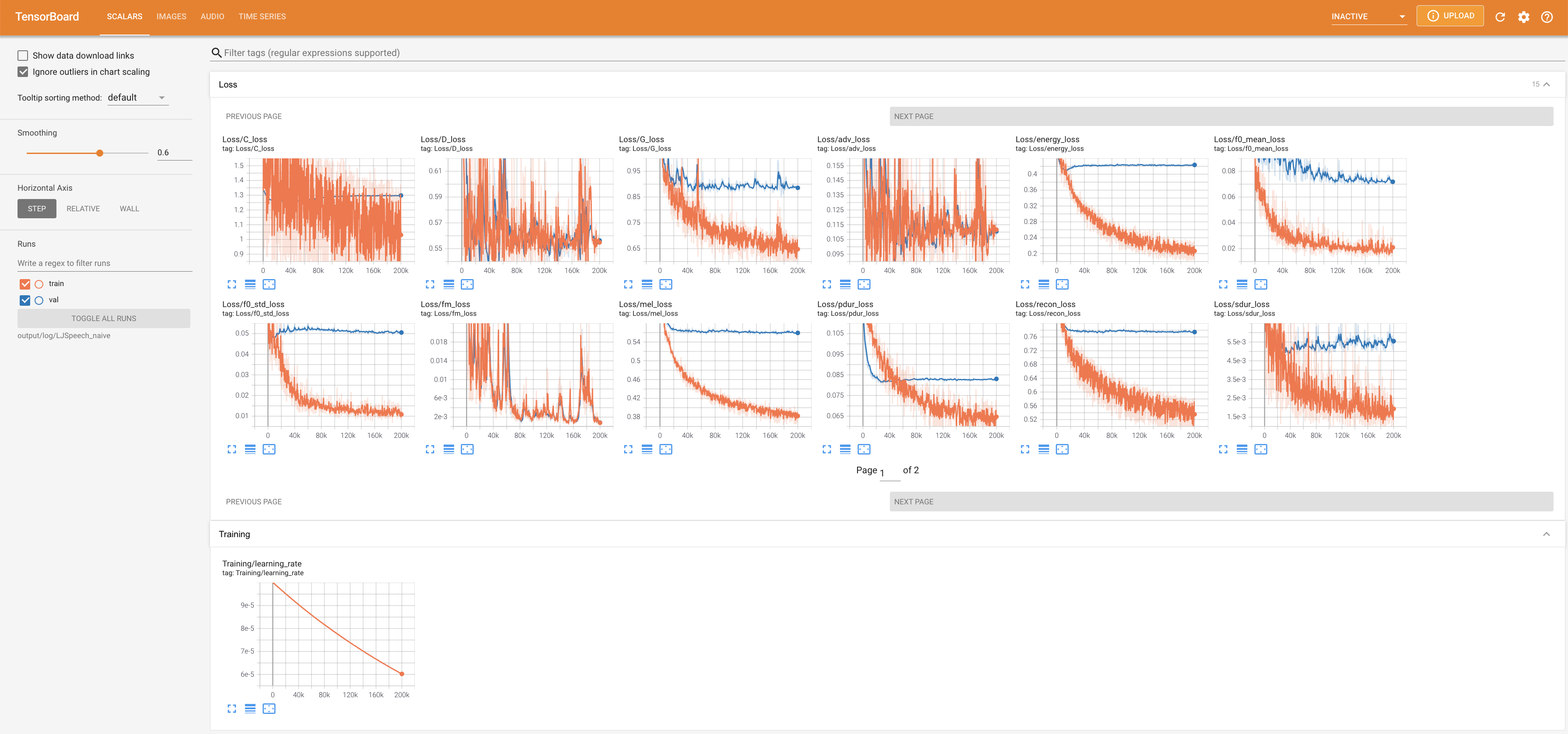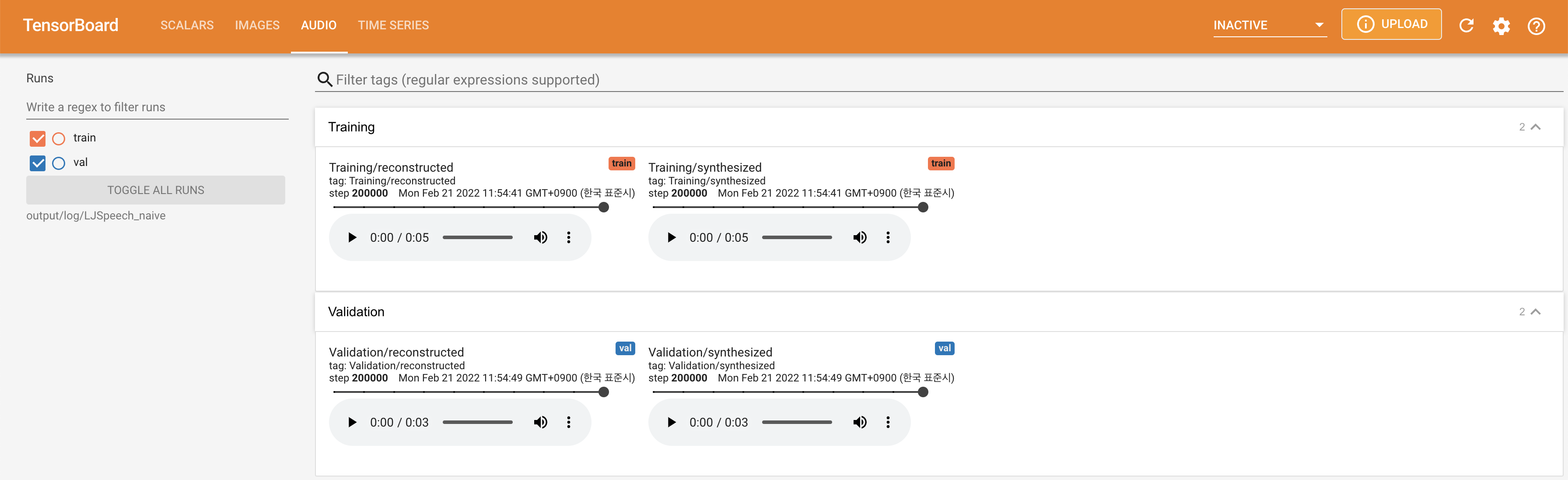 Tensorboard auf Ihrem örtlichen Haus servieren. Die Verlustkurven, synthetisierte Melspektrogramme und Audios werden gezeigt.
