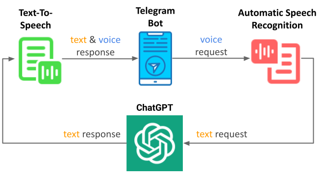 Laut der Weltgesundheitsorganisation (WHO) haben heute mehr als Hunderte von Millionen Menschen eine Art visuelle Behinderung. Sehbehinderung hat einen persönlichen Einfluss auf lebenslange Konsequenzen, da mehr als 80% unserer Wahrnehmung, Wahrnehmung, Lernen und täglichen Aktivitäten durch Vision vermittelt werden. Infolgedessen stagnieren sehbehinderte und blinde Menschen aufgrund unzugänglicher Technologien bei der Arbeit und in der Bildung. In dieser Hinsicht präsentieren wir ein sprachbasiertes Hilfesystem für sehbehinderte und blinde Menschen, um mit ChatGPT zu interagieren. Das System verwendet automatische Spracherkennung (ASR), Text-to-Speech (TTS) und einen Messenger-Bot (Telegramm), um mit ChatGPT über Sprachnachrichten zu chatten. Dieses Repository bietet einen Quellcode für die Entwicklung eines Telegrammbots für Englisch ( voice_chat_gpt_en ) und Kasach ( voice_chat_gpt_kk ). Wenn Ihnen dieses Projekt gefällt, zögern Sie nicht zu drücken * :) :)
