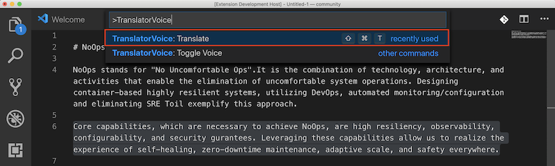 Führen Sie TranslatorVoice: Translate aus der Befehlspalette wie folgt: