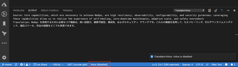 Sie können die Sprachfunktion deaktivieren/aktivieren, indem Sie (1) TranslatorVoice: Toggle Voice der Sprachbefehle aus der Befehlspalette oder (2) STATUSBARITEM mit dem Namen Voice [enabled/disabled] ausführen: