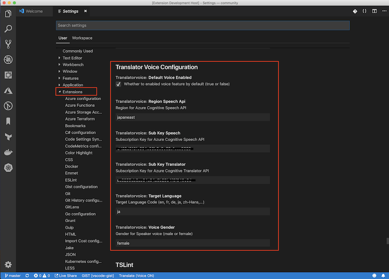 translatorvoice.subKeyTranslator : Abonnementschlüssel für die kognitive Übersetzer -APItranslatorvoice.subKeySpeech : Abonnementschlüssel für kognitive Sprachapitranslatorvoice.regionSpeechApi : Region für kognitive Sprachapi (Ex, Japanast, Eastus, ...). In dieser Seite finden Sie das Detail der verfügbaren Region für die APItranslatorvoice.targetLanguage : Zielsprachcode (En, Fr, de, Ja, Zh-Hans, ...). In dieser Seite finden Sie das Detail des unterstützten Sprachcode.translatorvoice.defaultVoiceEnabled : Ob standardmäßig die Sprachfunktion aktiviert werden soll: TRUE | Falschtranslatorvoice.voiceGender : Standardgeschlechtsspezifisch für Sprecher (männlich | weiblich) Öffnen Sie zunächst Settings editor aus dem folgenden VS -Code -Menübefehl oder verwenden Sie die Tastaturverknüpfung CTL + , (MAC: Cmd + , ).