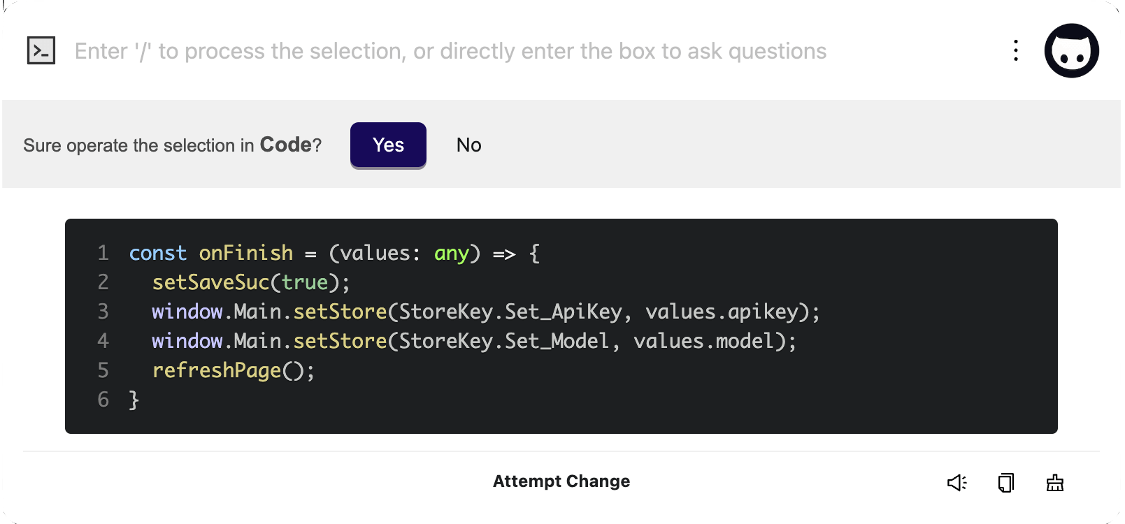 Zuerst müssen Sie links auf das Symbol klicken, um den entsprechenden Modus (z. B. Code Refactoring, Summarisierung usw.) auszuwählen und umzuschalten und dann ein Code -Stück in der IDE auszuwählen oder die Maus auf den aktuellen Browser zu konzentrieren. Verwenden Sie command + k , um global OnePoint aufzurufen. Zu diesem Zeitpunkt wird angezeigt, ob Änderungen an der Anwendung vorgenommen werden sollen, und wählen Sie yes .