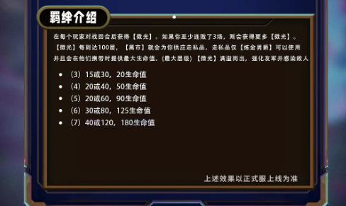 Gewinneffekt : Erhalte [Glimmer] nach jeder Spielerkampfrunde, wenn du mindestens 3 Spiele hintereinander verlierst, erhältst du jedes Mal mehr [Glimmer]; , die nur von [Alchemy Baron] verwendet werden können und maximale Gesundheit bieten, wenn sie getragen werden (maximale Stufe). [Glimmer] ist gefüllt, wodurch Verbündete gestärkt und Feinde infiziert werden.