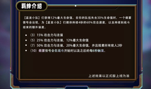 Verstärkungseffekt : [Blauhaariges Team] erhält 12 % seiner maximalen Gesundheit. Wenn Ihr Team 30 % Gesundheit verliert, erscheint ein Rauchsignal, das dem [blauhaarigen Team] 4 Sekunden lang 60 % Angriffsgeschwindigkeit sowie zusätzliche Stärke verleiht, die bis zum Ende des Kampfes anhält.