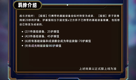 Verstärkungseffekt : Wenn der Kampf beginnt, wird die von [Geeks] getragene Grundausrüstung vorübergehend in fertige Ausrüstung umgewandelt. [Geek] Der Spieler erhält einen Schild, der 20 Sekunden lang anhält. Der Schildwert entspricht einem festen Wert x der Anzahl der von seinem Spieler getragenen Grundausrüstung, einschließlich derjenigen, die in fertige Ausrüstung umgewandelt wurden.