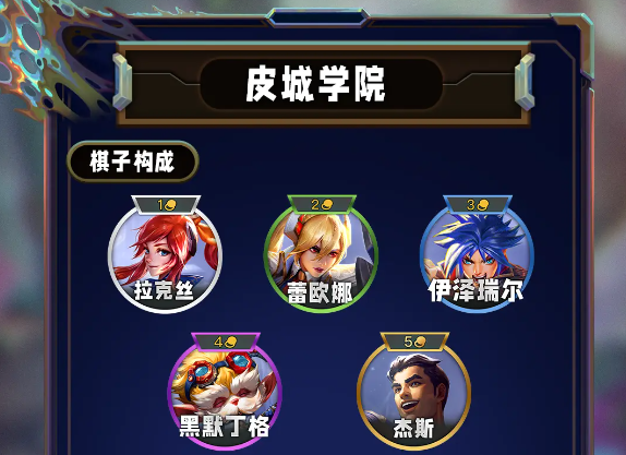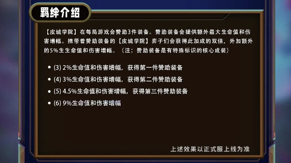 Gewinneffekt : [Pi City Academy] wird in jedem Spiel 3 Ausrüstungsgegenstände sponsern. Gesponserte Ausrüstung sorgt für zusätzliche maximale Gesundheits- und Schadenssteigerungen. [Piltover Academy]-Spieler, die gesponserte Ausrüstung tragen, erhalten das Doppelte dieses Bonus sowie zusätzlich 5 % mehr Gesundheit und Schaden.