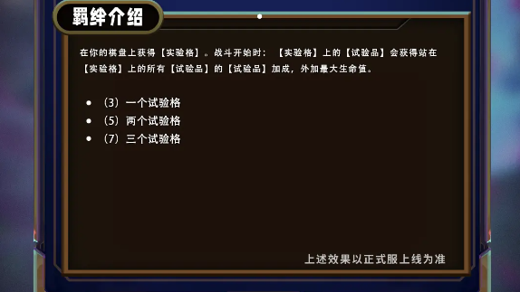 Buff-Effekt : Holen Sie sich [Experimental Grid] auf Ihr Board. Wenn der Kampf beginnt, erhält das [Experimentalobjekt] auf dem [Experimentalgitter] den [Experimentalobjekt]-Bonus aller [Experimentalobjekte] auf dem [Experimentalgitter] sowie den maximalen Gesundheitswert.