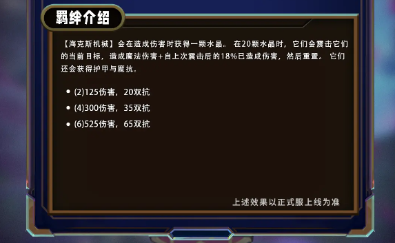 Buff-Effekt : [Hex Machinery] erhält einen Kristall, wenn es Schaden verursacht. Bei 20 Kristallen versetzen sie ihr aktuelles Ziel mit einem Schock, der magischen Schaden + 18 % des seit dem letzten Schock verursachten Schadens verursacht und dann zurückgesetzt wird. Sie erhalten außerdem Rüstung und Fäulnisresistenz.