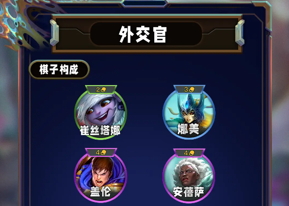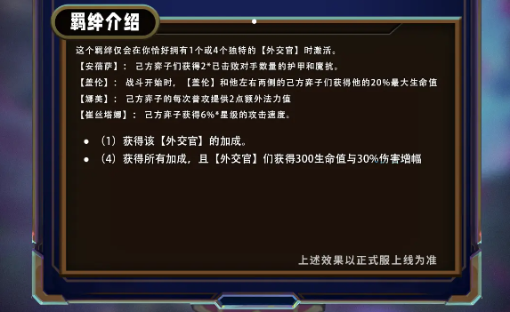 Buff : Diese Bindung wird nur aktiviert, wenn Sie genau 1 oder 4 einzigartige [Diplomaten] haben. [Anhoza]: Deine Spieler erhalten Rüstung und Magieresistenz in Höhe des Zweifachen der Anzahl besiegter Gegner. [Galen]: Zu Beginn des Kampfes erhalten [Galen] und seine Schachfiguren auf seiner linken und rechten Seite 20 % seiner maximalen Gesundheit. [Nami]: Jeder normale Angriff seiner Schachfiguren bringt 2 zusätzliche Manapunkte. Deine Schachfigur erhält 6 % „Sternangriffsgeschwindigkeit“