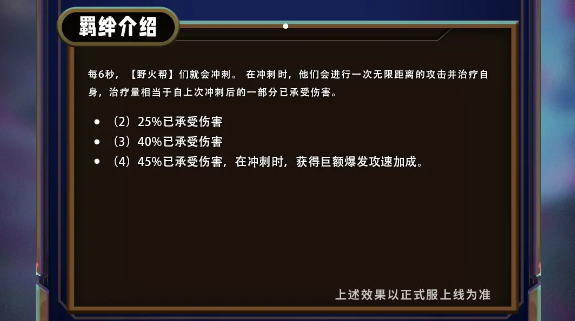 Buff-Effekt : Alle 6 Sekunden sprintet [Wildfire Gang]. Während sie sprinten, führen sie einen Angriff mit unendlicher Reichweite durch und heilen sich um einen Teil des Schadens, den sie seit ihrem letzten Sprint erlitten haben.