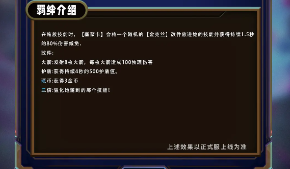 Buff-Effekt : Wenn der Clan eine Fertigkeit einsetzt, fügt [Sevika] eine zufällige [Jinx]-Modifikation in ihre Fertigkeit ein und erhält 1,5 Sekunden lang eine Schadensreduzierung von 80 %.
