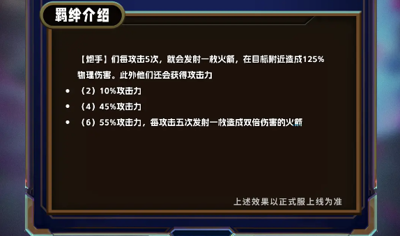 Verstärkungseffekt : [Gunners] feuern alle 5 Angriffe eine Rakete ab, die in der Nähe des Ziels 125 % physischen Schaden verursacht. Zusätzlich gewinnen sie an Angriffskraft.